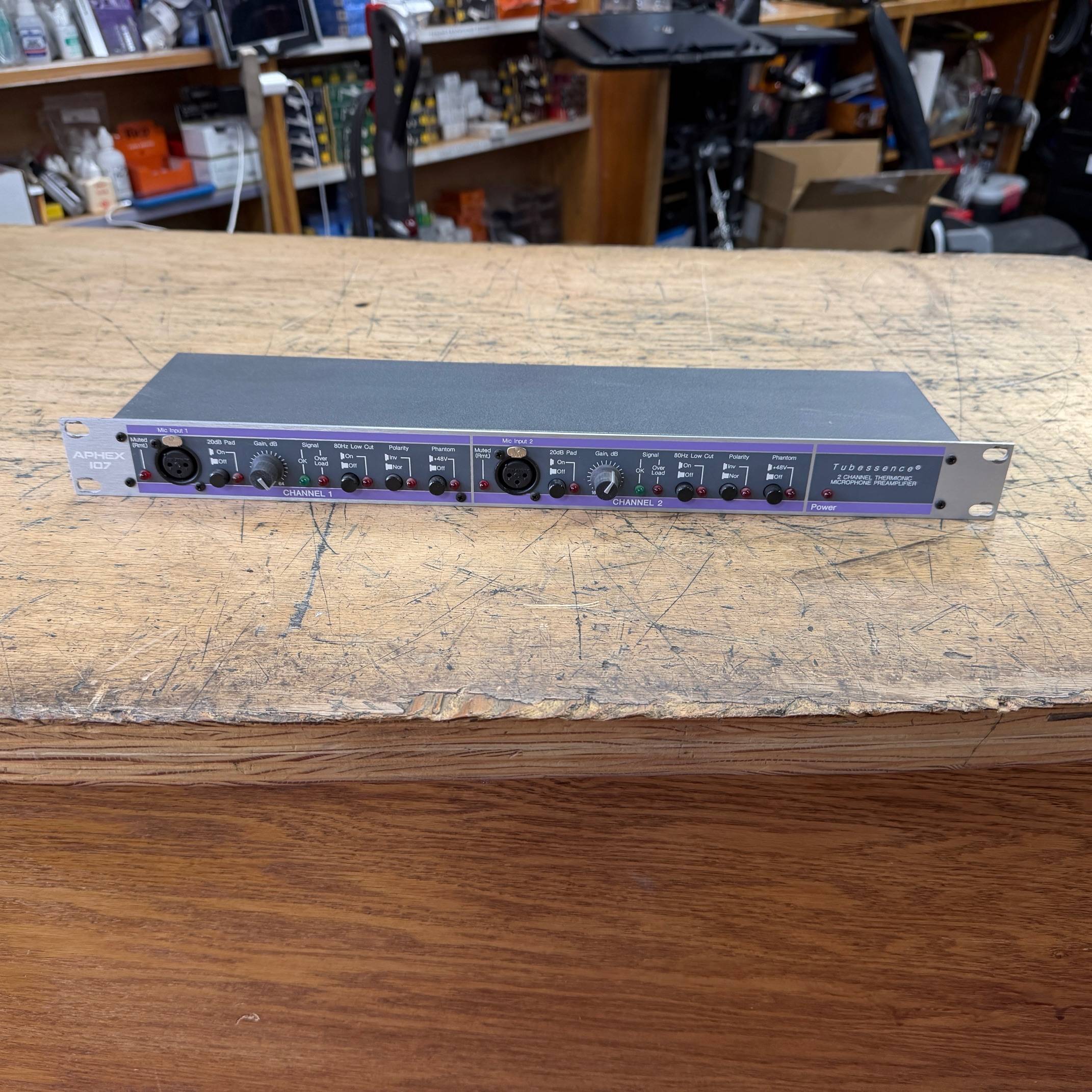 Aphex Model 107, a dual-channel tube microphone preamplifier renowned for its warm, detailed sound and versatile functionality. Utilizing Aphex’s patented “Tubessence” technology, this preamp combines a solid-state front end with a low-voltage tube gain stage, delivering the sonic characteristics of traditional tube amplification while maintaining low noise and extended tube life. Each of the two independent channels offers up to 64dB of gain, accommodating a wide range of microphones and recording scenarios.
