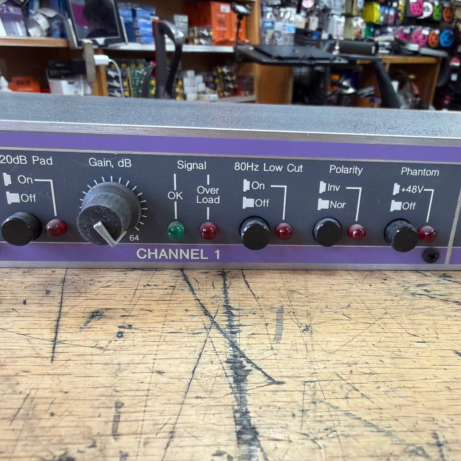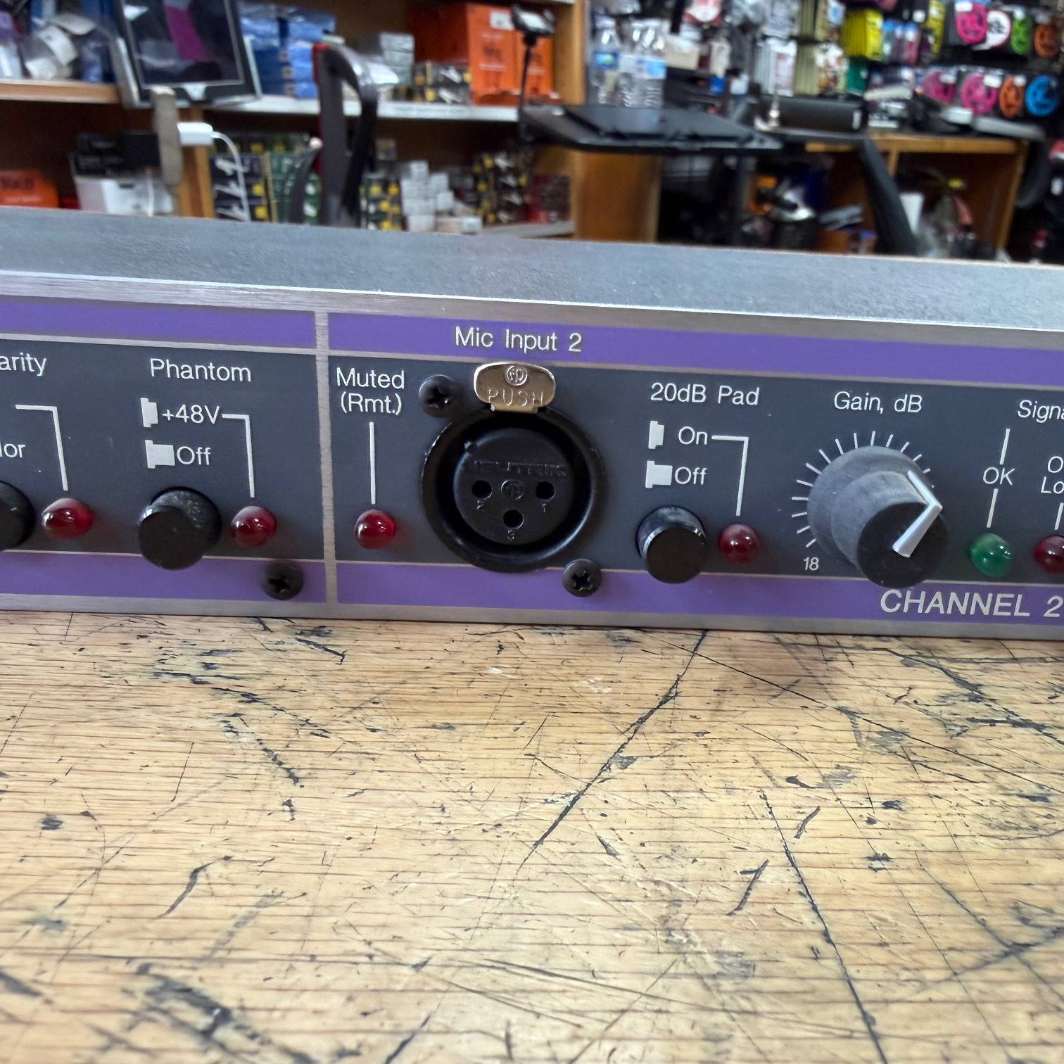 The front panel features XLR inputs for easy access, along with essential controls including a 20dB pad, phase invert switch, 80Hz low-cut filter (12dB/octave), and a continuously variable gain knob. Each channel is equipped with independently switchable 48V phantom power, indicated by a red LED, ensuring compatibility with condenser microphones. Additionally, signal presence and overload LEDs provide visual monitoring to prevent clipping. The rear panel offers impedance-balanced 1/4″ TRS outputs with selectable +4dBu or -10dBV operating levels, enhancing integration with various audio interfaces and recording equipment.