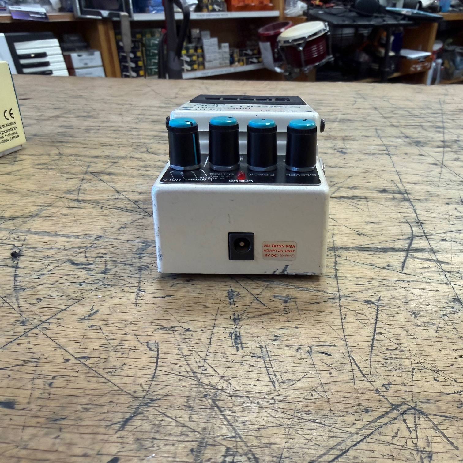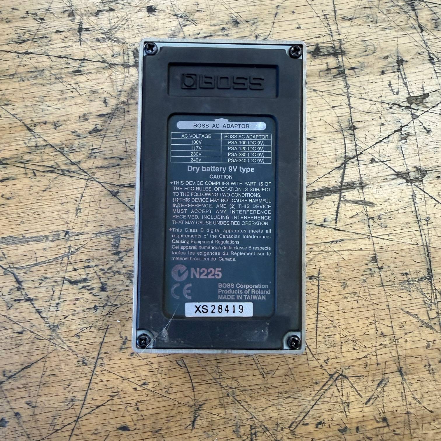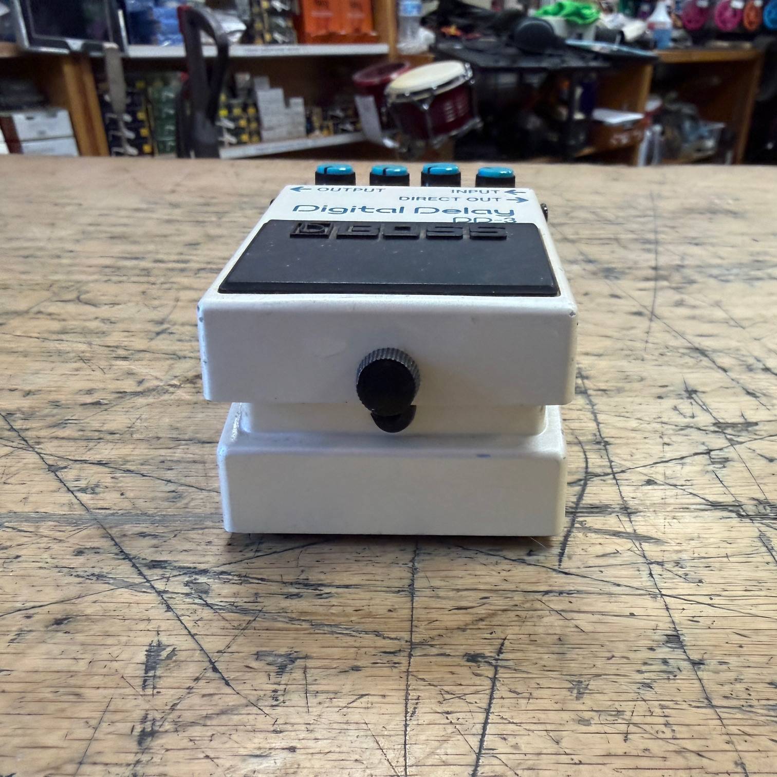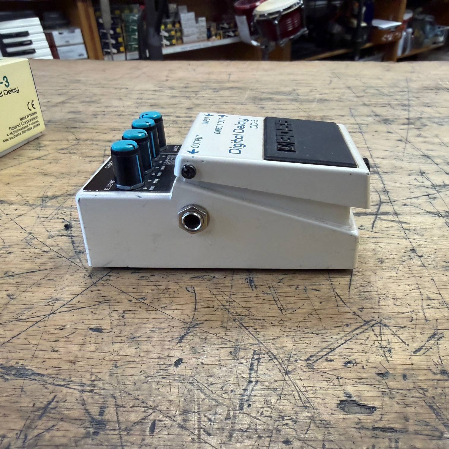 Up for sale is a used Boss DD-3 Digital Delay Guitar Pedal. This one was just tested in our shop and works as it should. It is in good cosmetic condition, but the grommet for the pedal/battery box is starting to fall apart (this does not affect functionality). The pedal was made in Taiwan, serial number XS28419. It comes in its original box. No AC adapter included. Check out the pictures, or come see it in person at Metro Gnome Music.