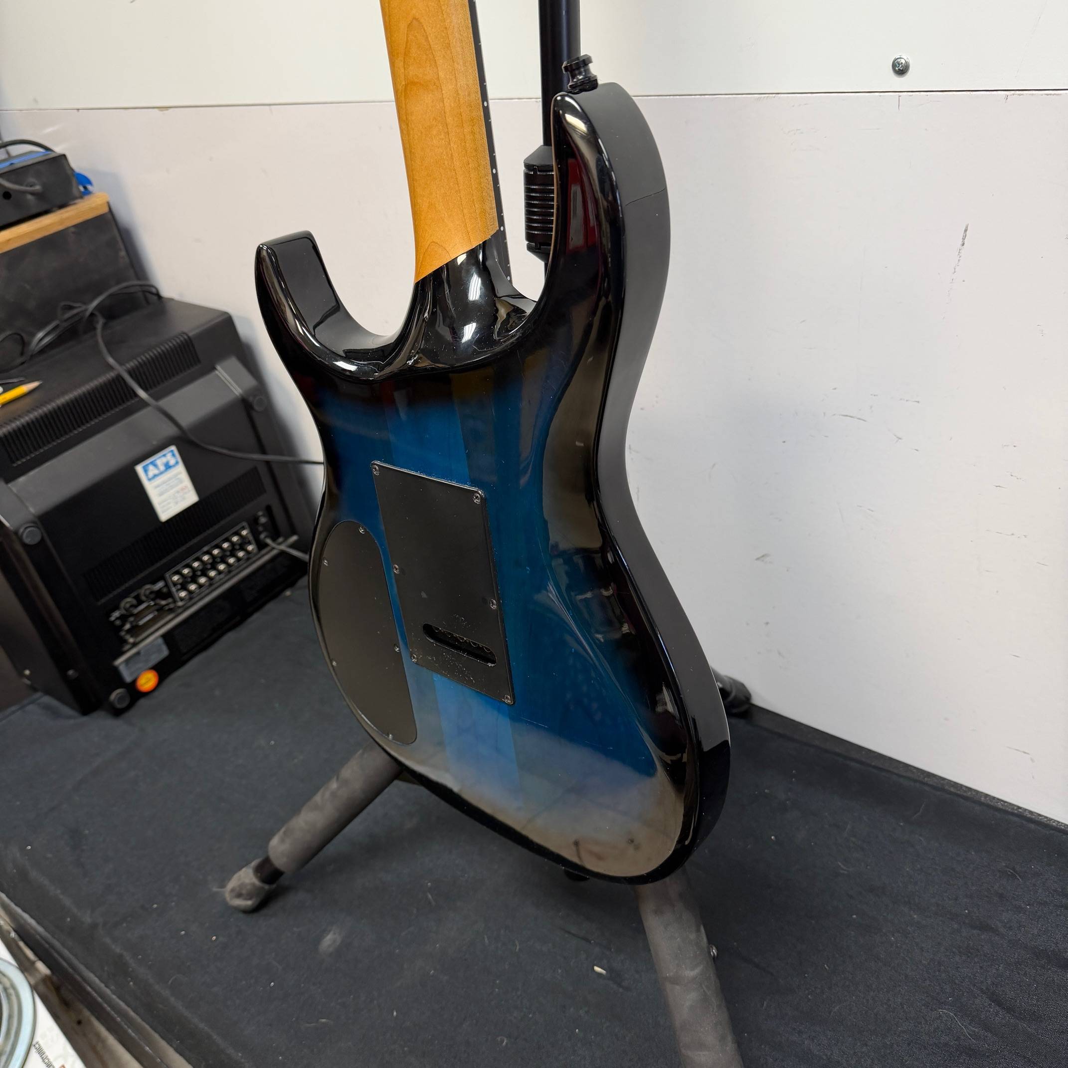 Up for sale is a used Carvin DC400 neck thru electric guitar. This one was just cleaned up and had quite a bit of work done to it. The guitar came to us with active EMG’s that weren’t wired correctly with tone pots and switches that were on the guitar. I contacted Carvin/Kiesel and they sent me a Kiesel M22SD bridge and M22V neck pickup. I had my luthier put these in and re-wire the guitar to factory spec. It plays and sounds great now. It shows some minor wear, and a small ding on the top of the headstock. This guitar features Sperzel locking tuners, a Wilkinson tremolo, and a neck thru body design. The guitar was made in the USA, serial number 51391. It comes with strap locks, a strap, the original whammy bar, and the original contoured Carvin case. Check out all the pictures