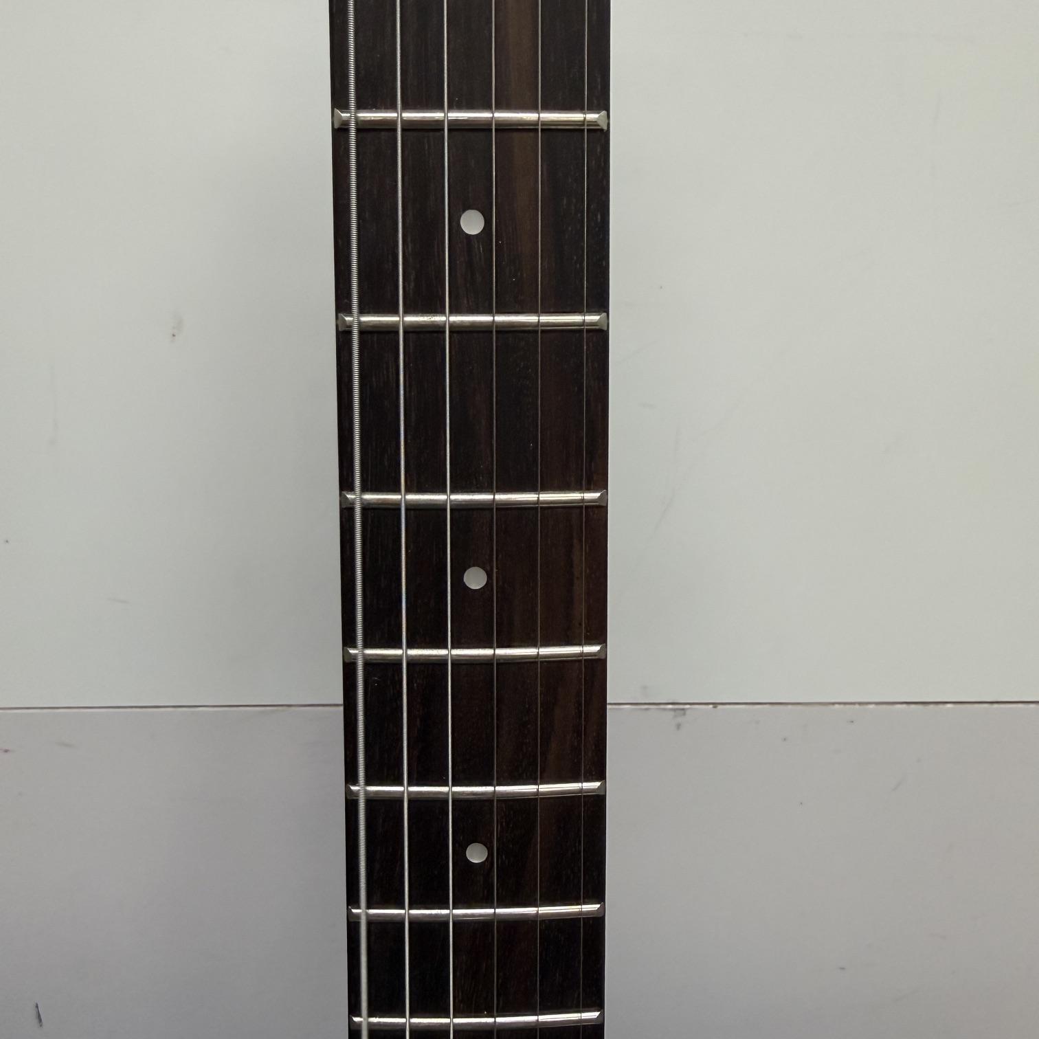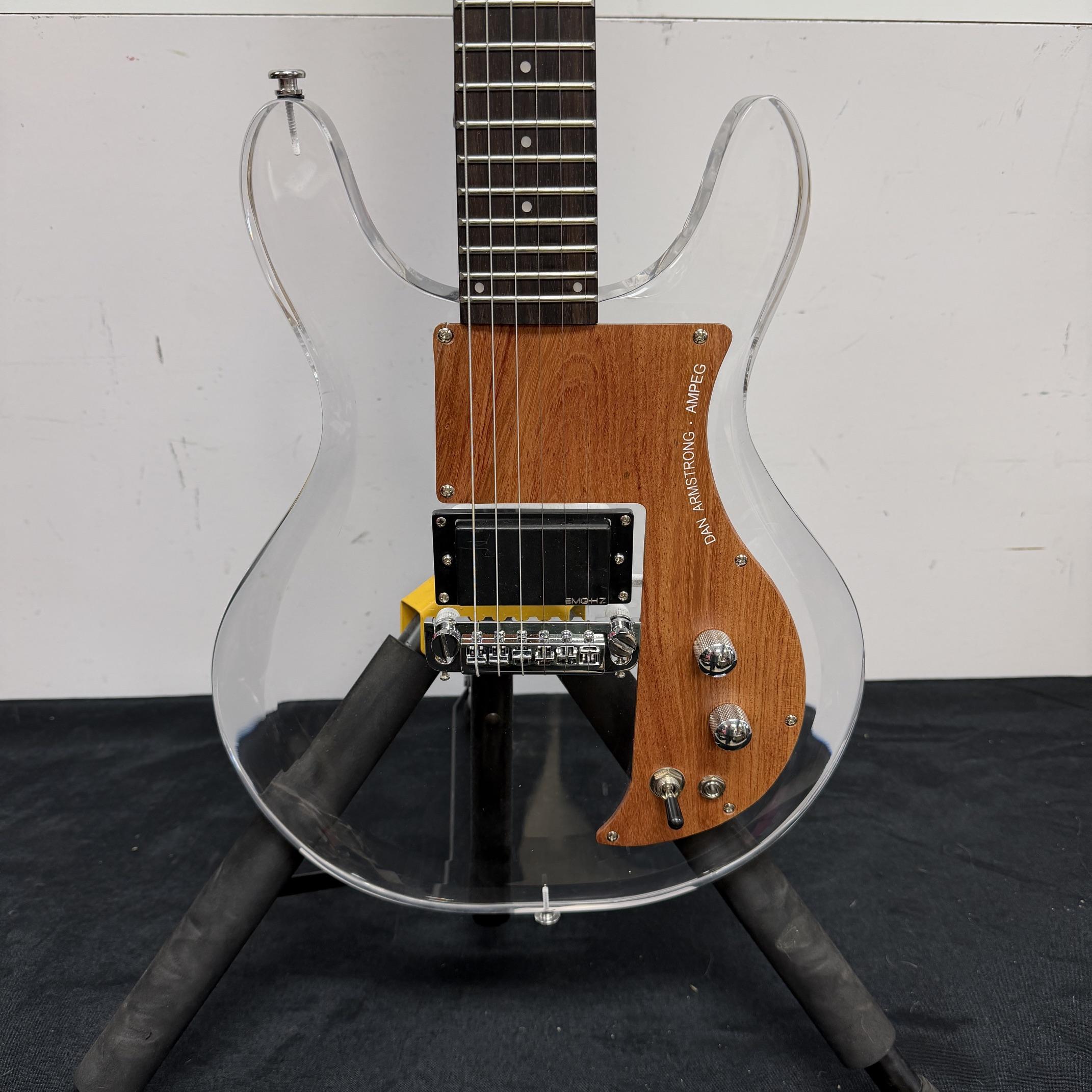 Up for sale is a used custom clear Lucite double cutaway electric guitar. This is a copy of an Ampeg Dan Armstrong (I think the pickguard was also custom made with this information on it). The guitar was just set up with new strings and plays great. The only blemish, seemingly, is one of the pick guard screw cracked the pickguard in the upper left corner of the top, but it is secure. It has an EMG HZ passive humbucker in the bridge position, a volume control, a tone control, and a three way switch that changes the pickup voicing. No case included. Check out the pictures.