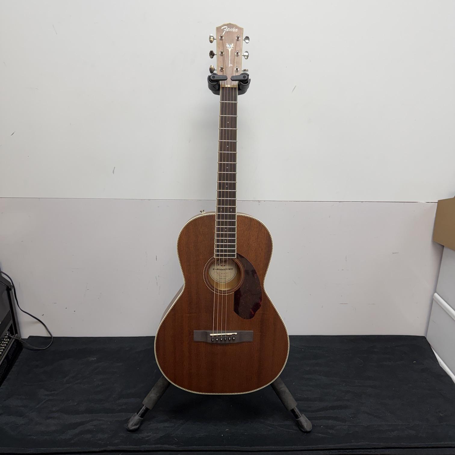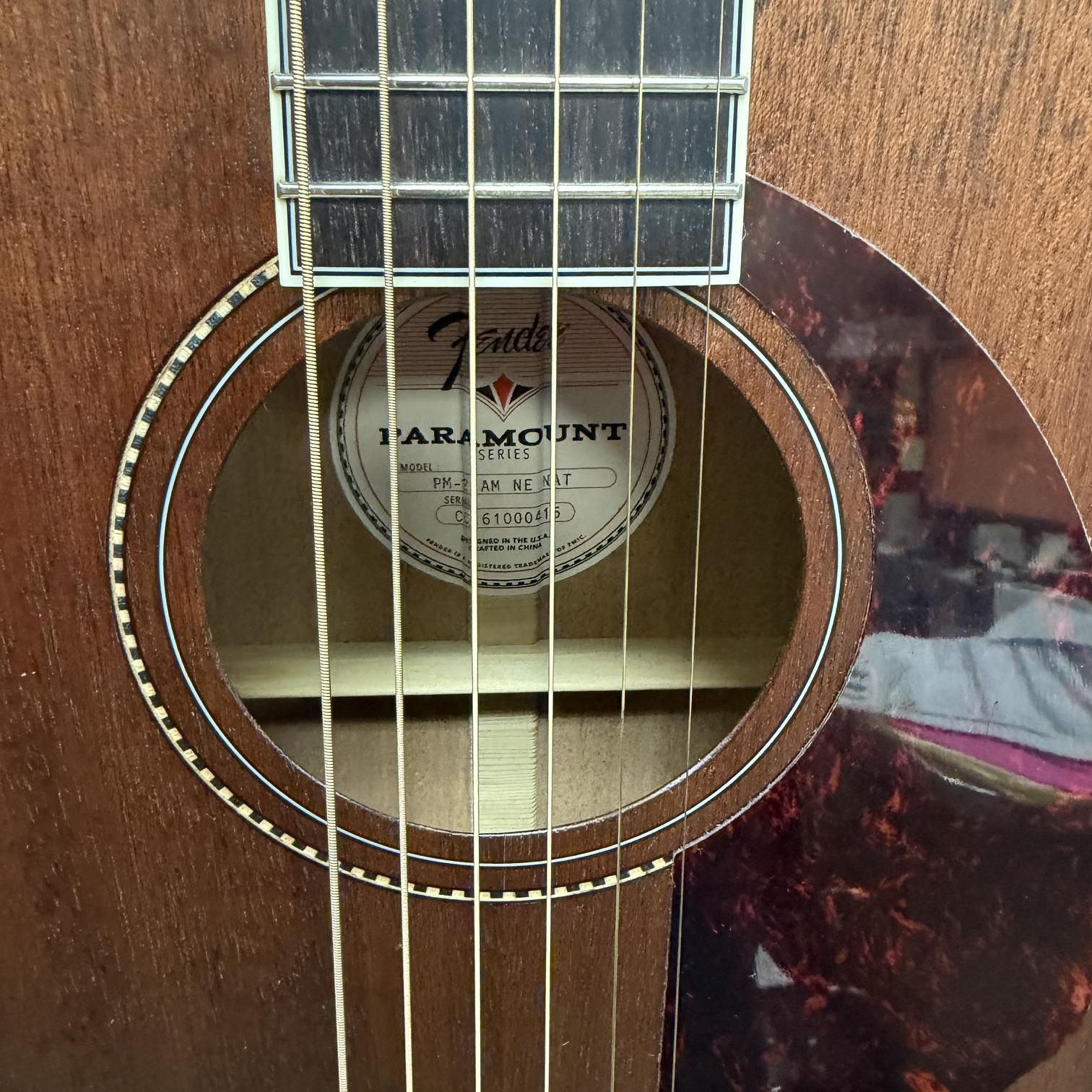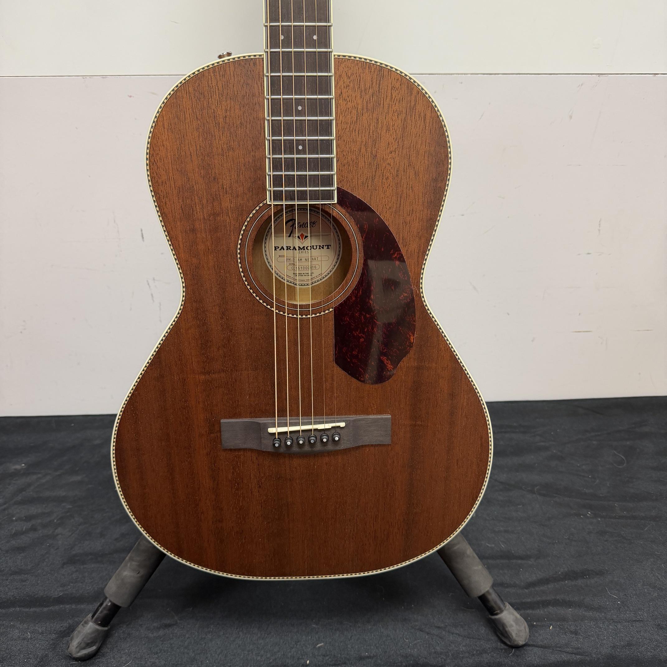 Up for sale is a used Fender Paramount Series PM-2 parlor size acoustic guitar. This one was just cleaned up and restrung here in the shop and plays great. It is in very good cosmetic condition with no major scratches or dings. It was made in China, serial number CC161000416. It comes in its original case with its hang tag and warranty information. Check out the pictures.