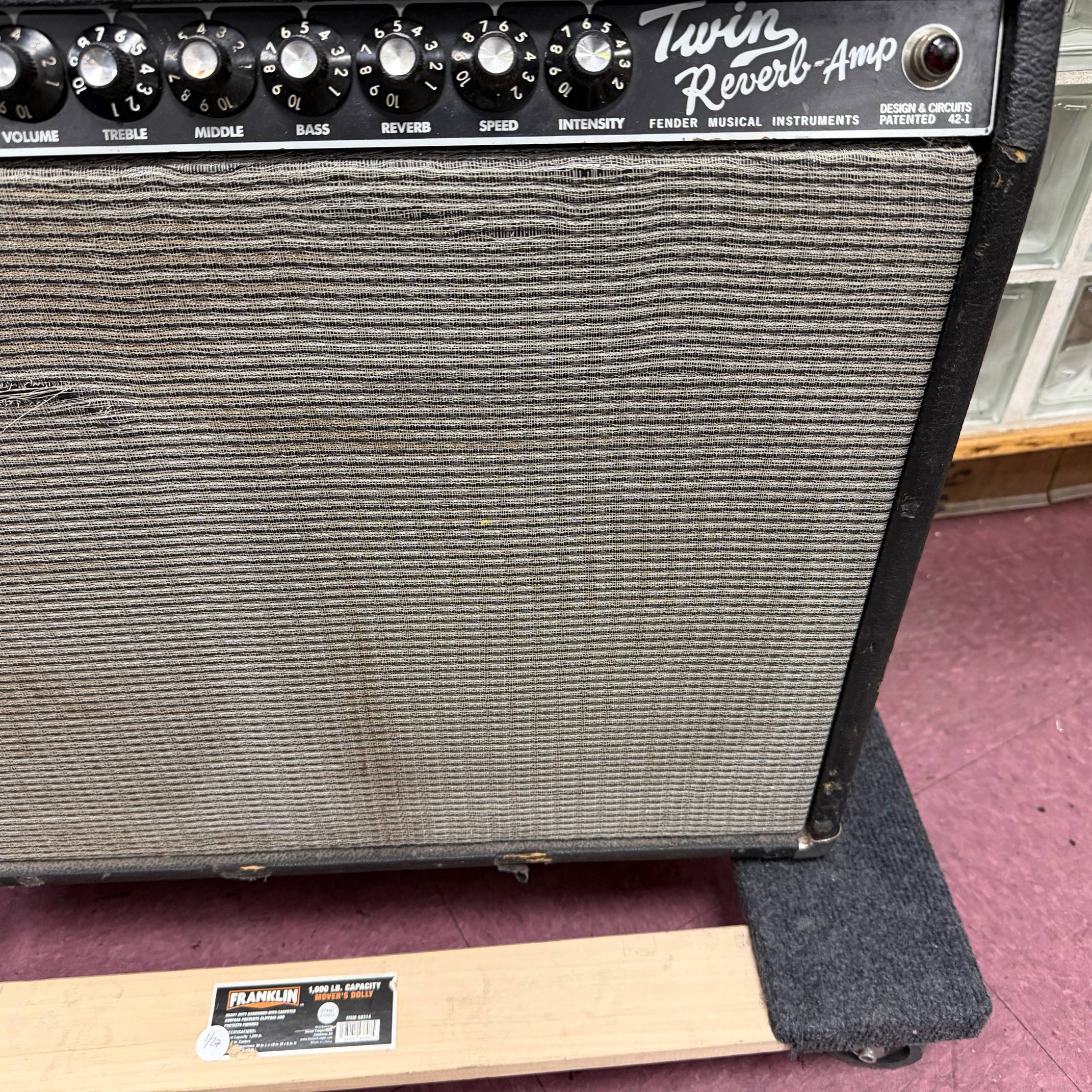 Up for sale is a Fender Twin Reverb Amp tube guitar amplifier. This one was just tested here in our shop, was serviced by our tech, and is ready to go. The amp is in fair cosmetic condition, with wear throughout. The footswitch is included. The amp was made in the USA, serial number A739079. (Rolling dolly not included). Check out the picture, or come see it in person at Metro Gnome Music.