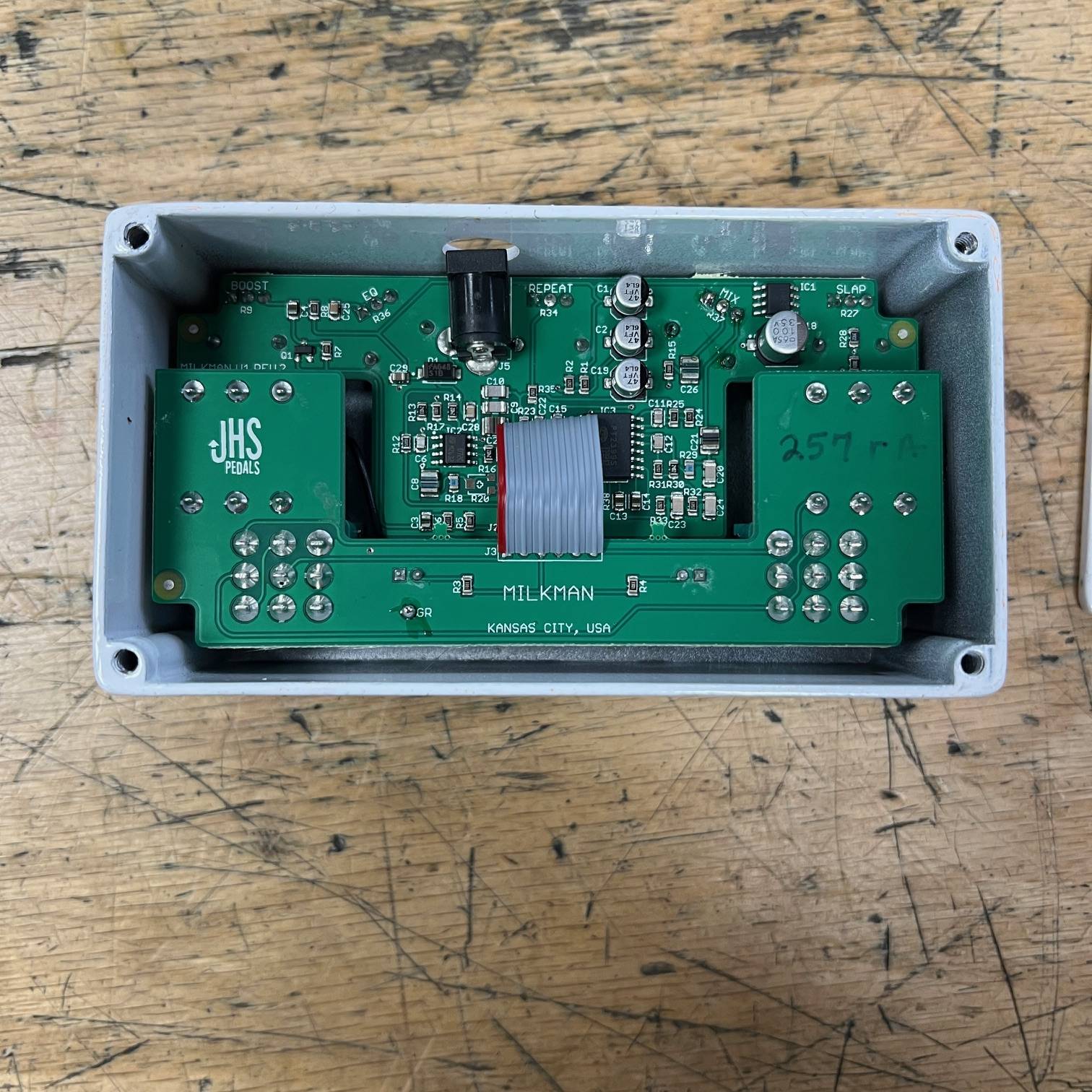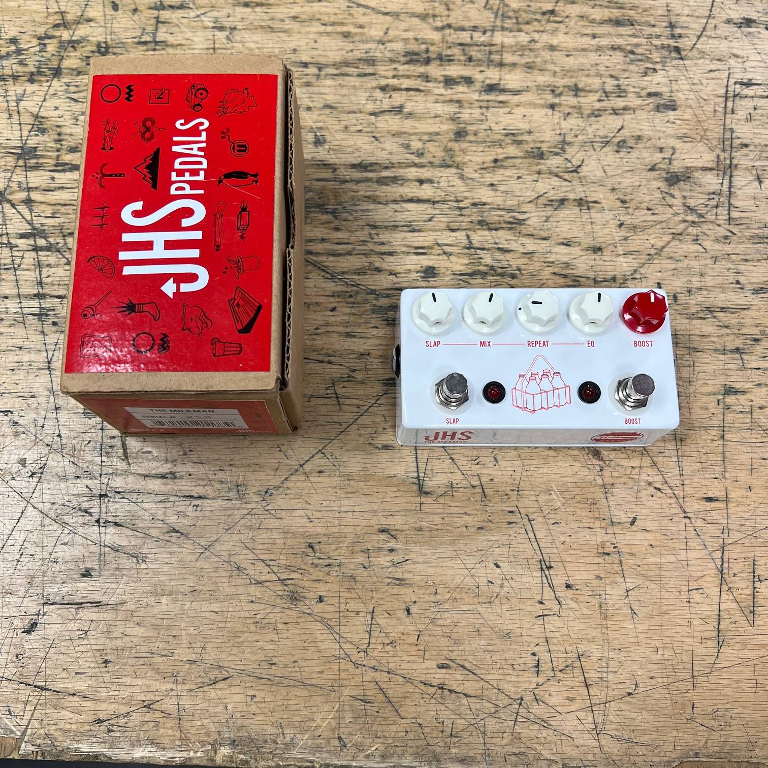 Up for sale is a used JHS Pedals The Milkman SLAP ECHO DELAY Guitar Pedal. We just tested and cleaned this one and it sounds great/works as it should. This one was made in the USA, serial number 257. This one is in good cosmetic condition and comes with its original box. It does have some adhesive residue from having velcro on it that I can’t get off without affecting the original label on the bottom. No AC Adapter included. Please check out all the pictures for the condition, or come play it in person at Metro Gnome Music.