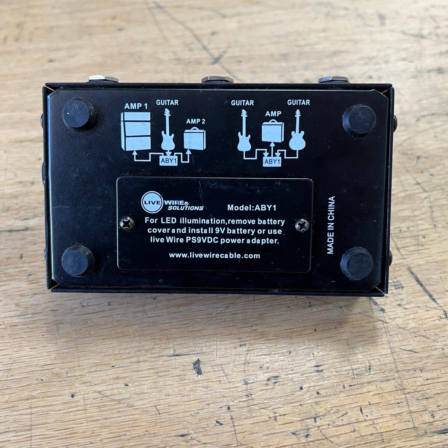 The Live Wire ABY1 selector/combiner footswitch has dozens of uses on stage and in the studio. You can plug 2 guitars into a single amp for convenient, on-stage instrument changes, or plug a single guitar into 2 different amps to switch sounds quickly and easily. Plus, the Live Wire ABY1 accepts a 9V power adapter, eliminating the need for battery replacement.
