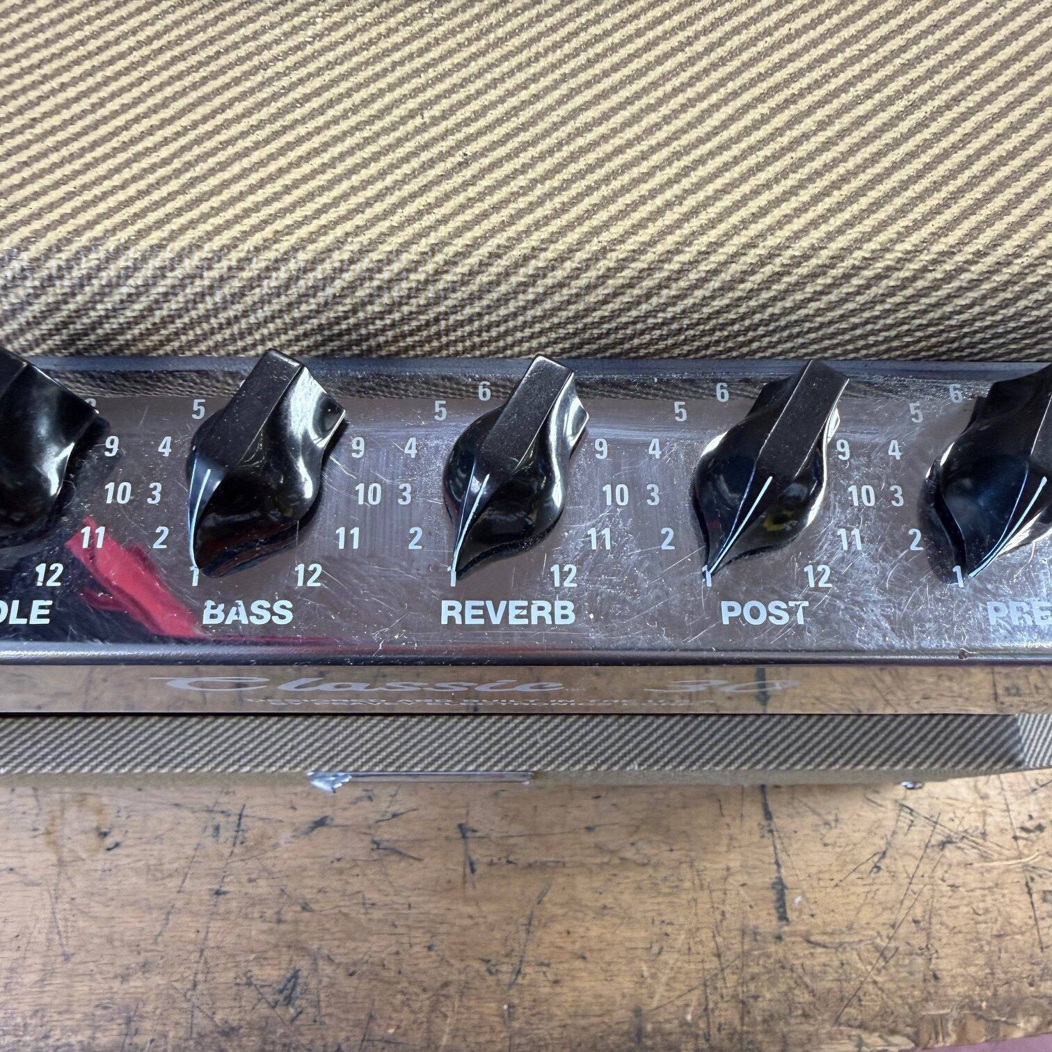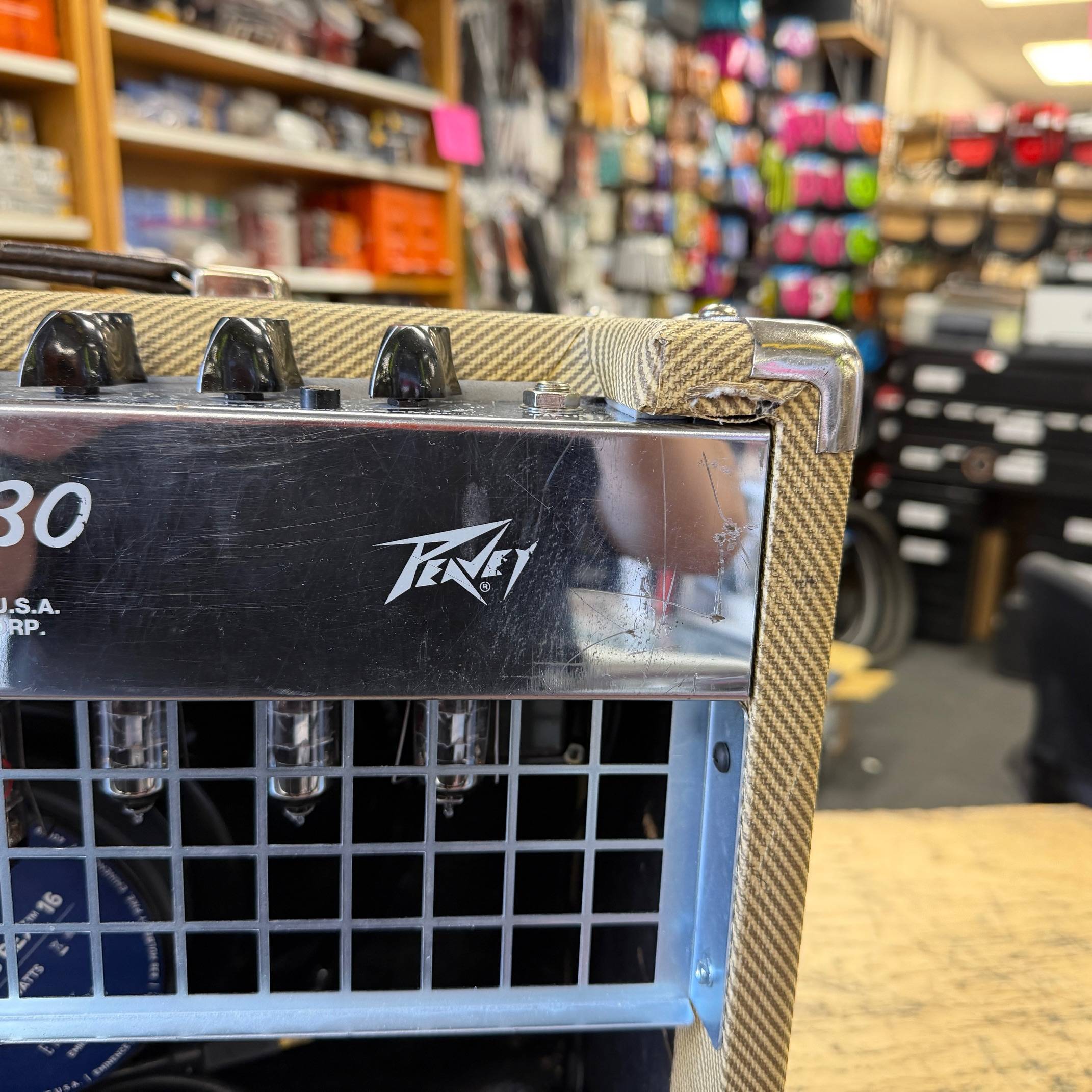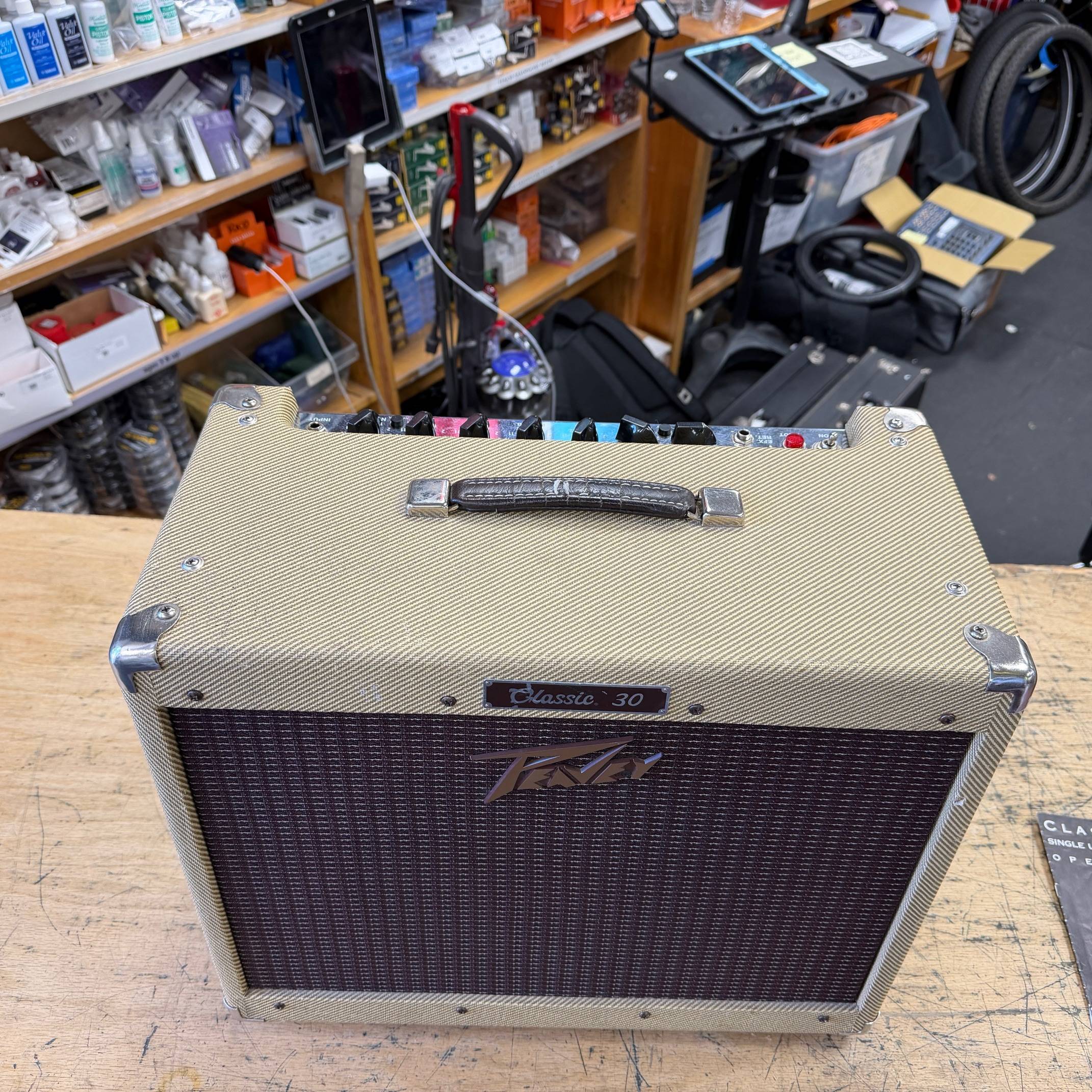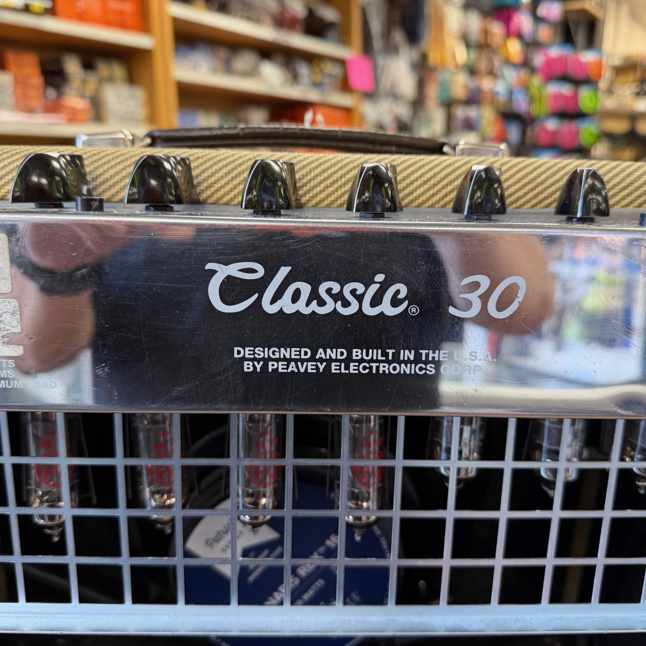 Up for sale is a used Peavey Classic 30 1×12 tube combo guitar amplifier. This one was just tested here in our shop and sounds great. The speaker is an Eminence Patriot Cannabis Rex 16 and it has newer JJ tubes installed. The amp shows some cosmetic wear (check out the pictures). The amp was made in the USA, serial number 00-06822099. Check out the pictures for the cosmetic condition, or come see it at Metro Gnome Music