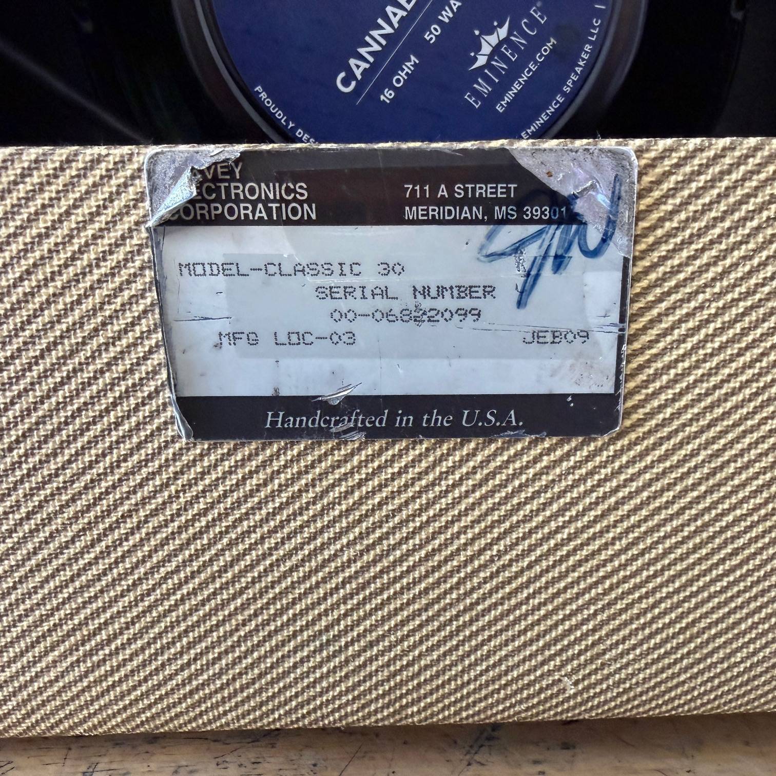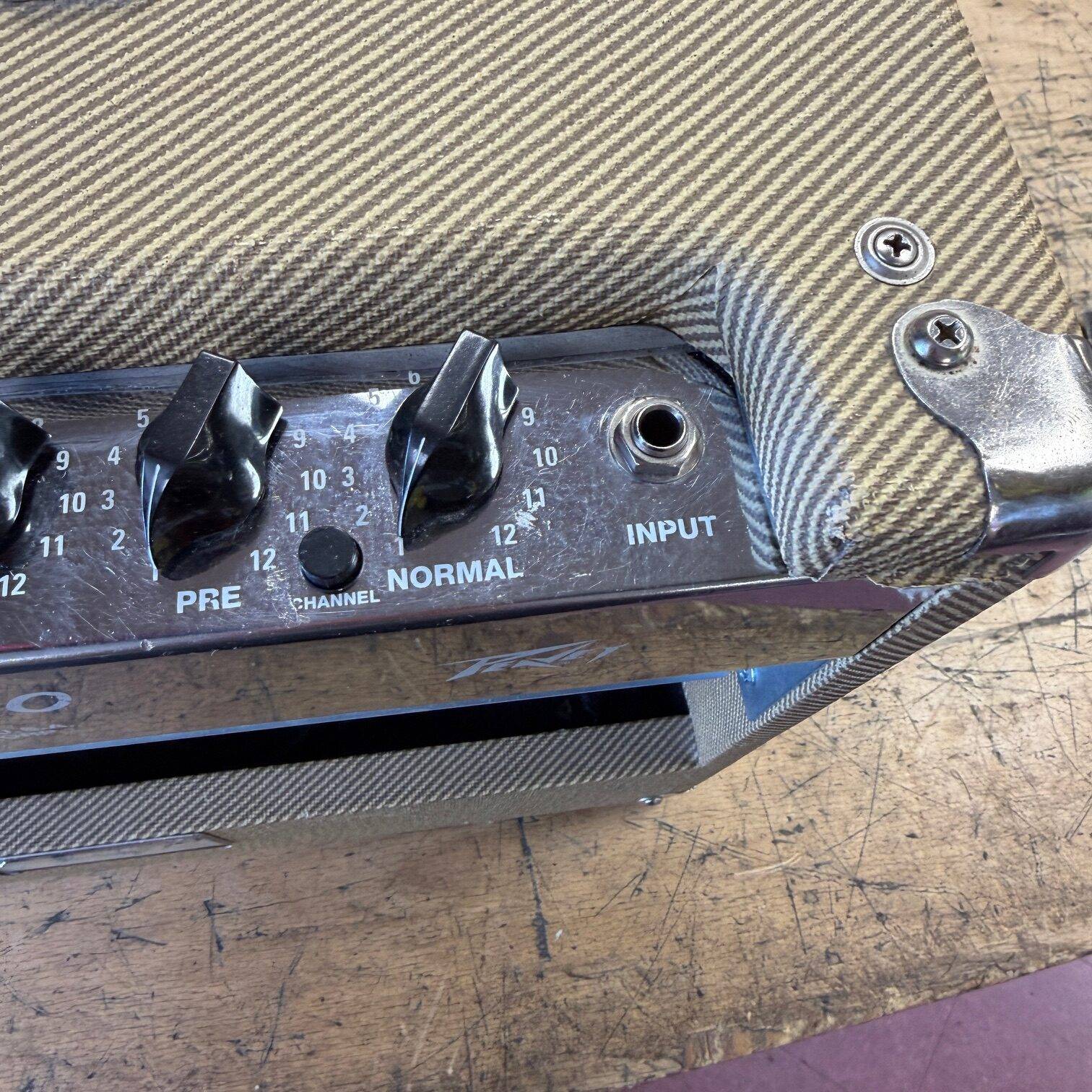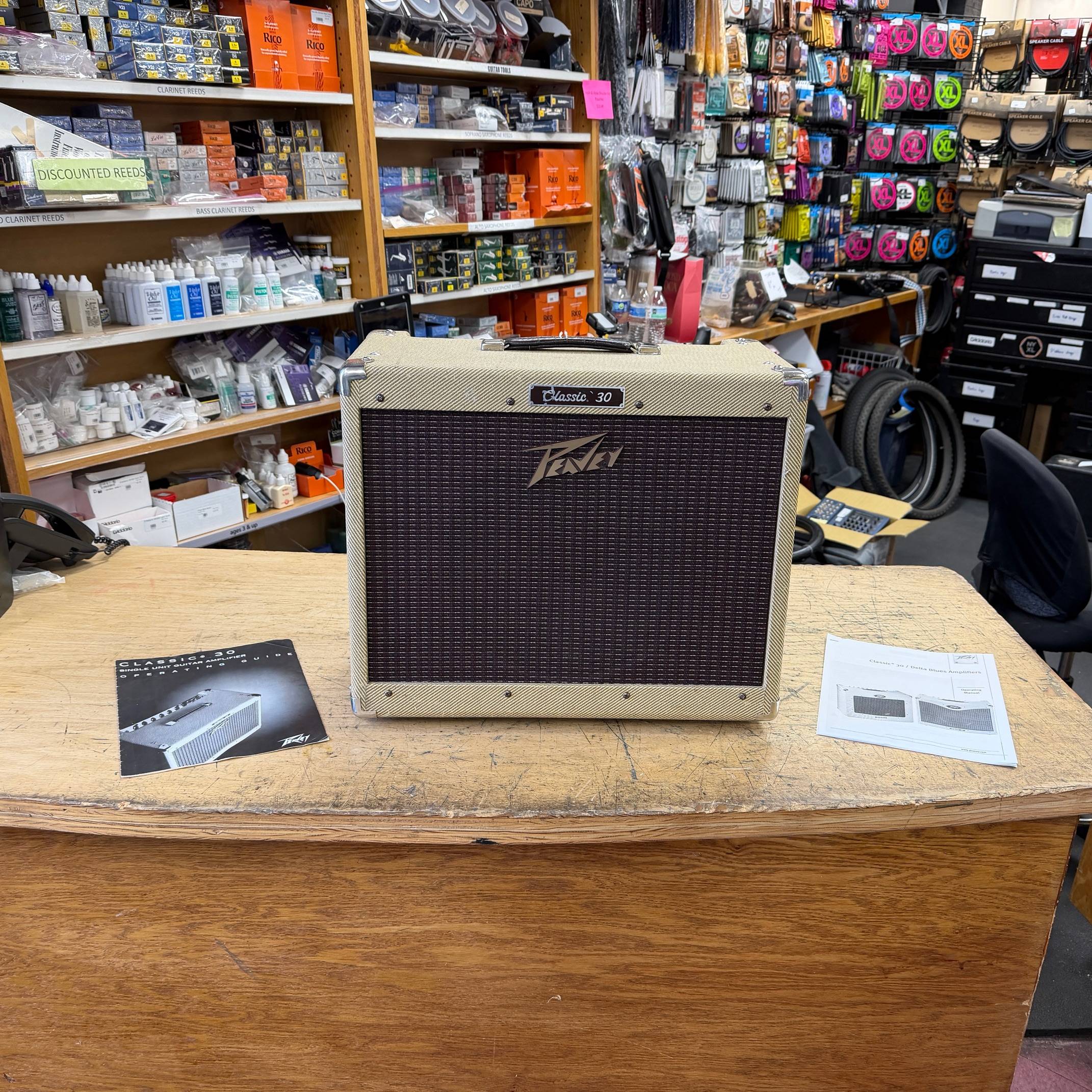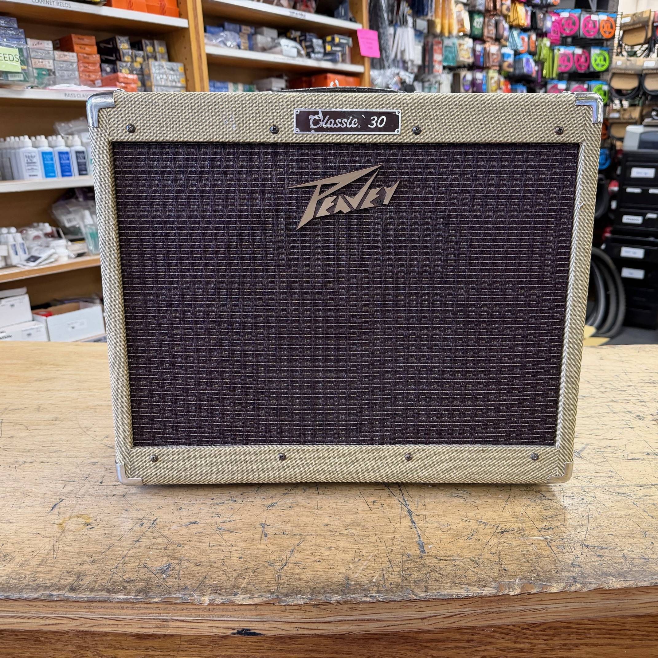 Up for sale is a used Peavey Classic 30 1×12 tube combo guitar amplifier. This one was just tested here in our shop and sounds great. The speaker is an Eminence Patriot Cannabis Rex 16 and it has newer JJ tubes installed. The amp shows some cosmetic wear (check out the pictures). The amp was made in the USA, serial number 00-06822099. Check out the pictures for the cosmetic condition, or come see it at Metro Gnome Music