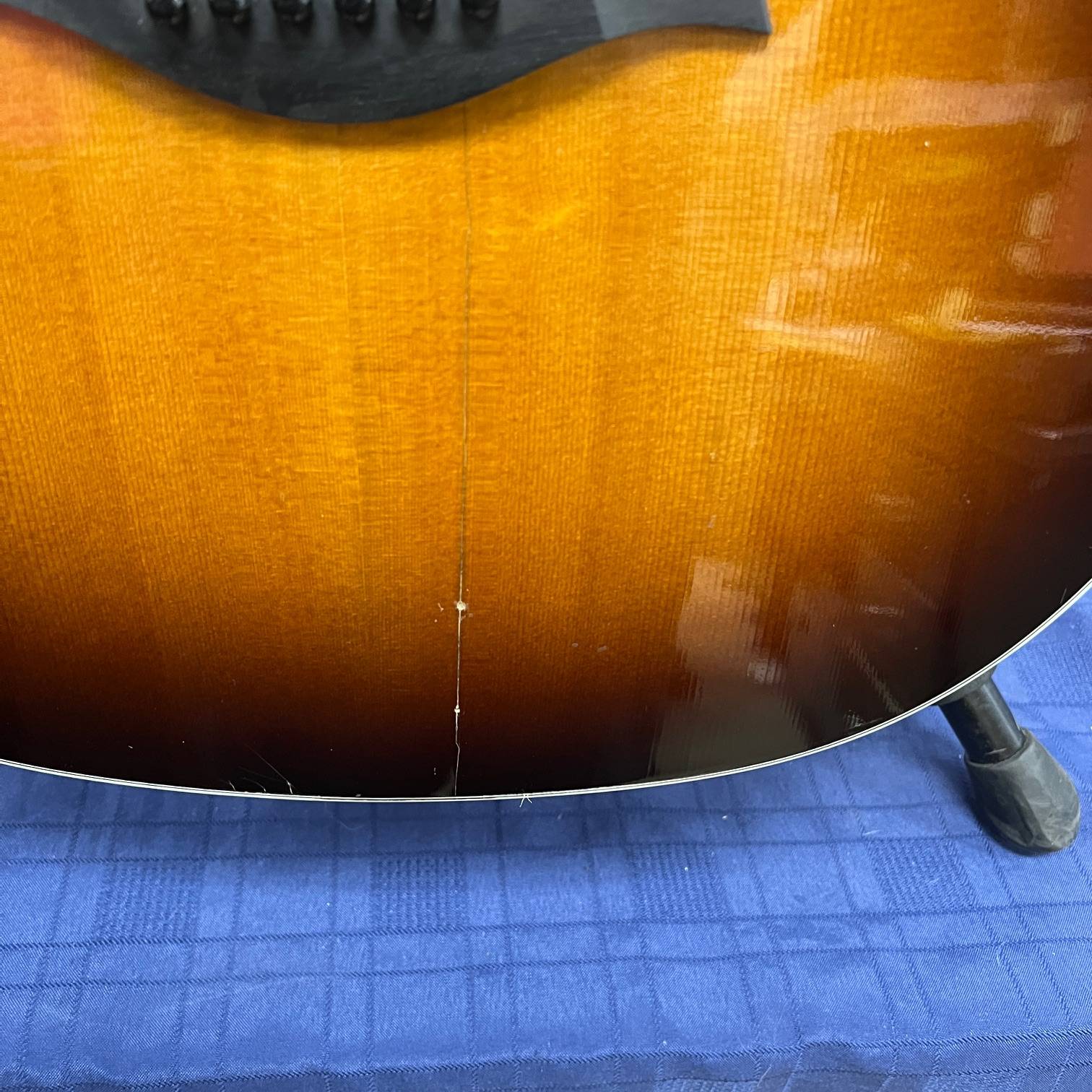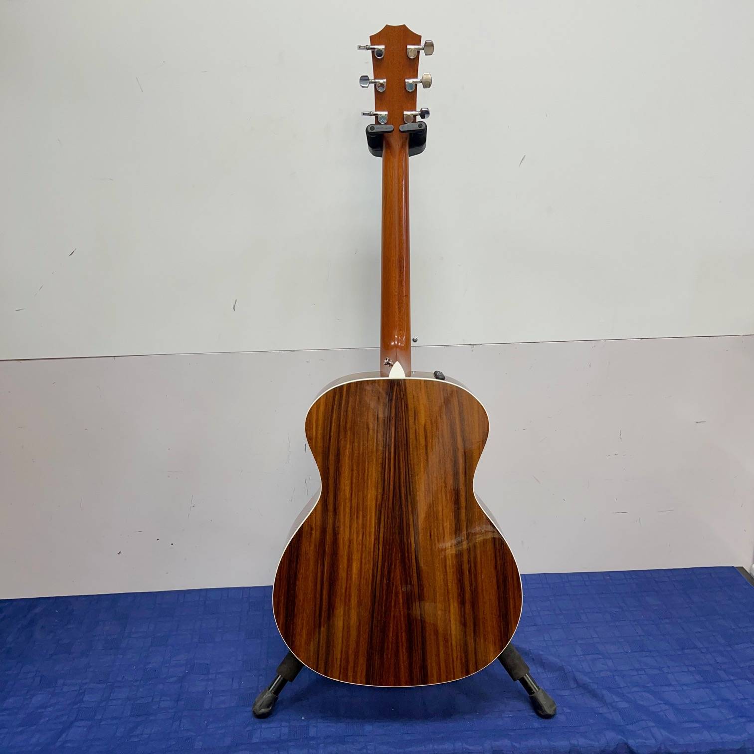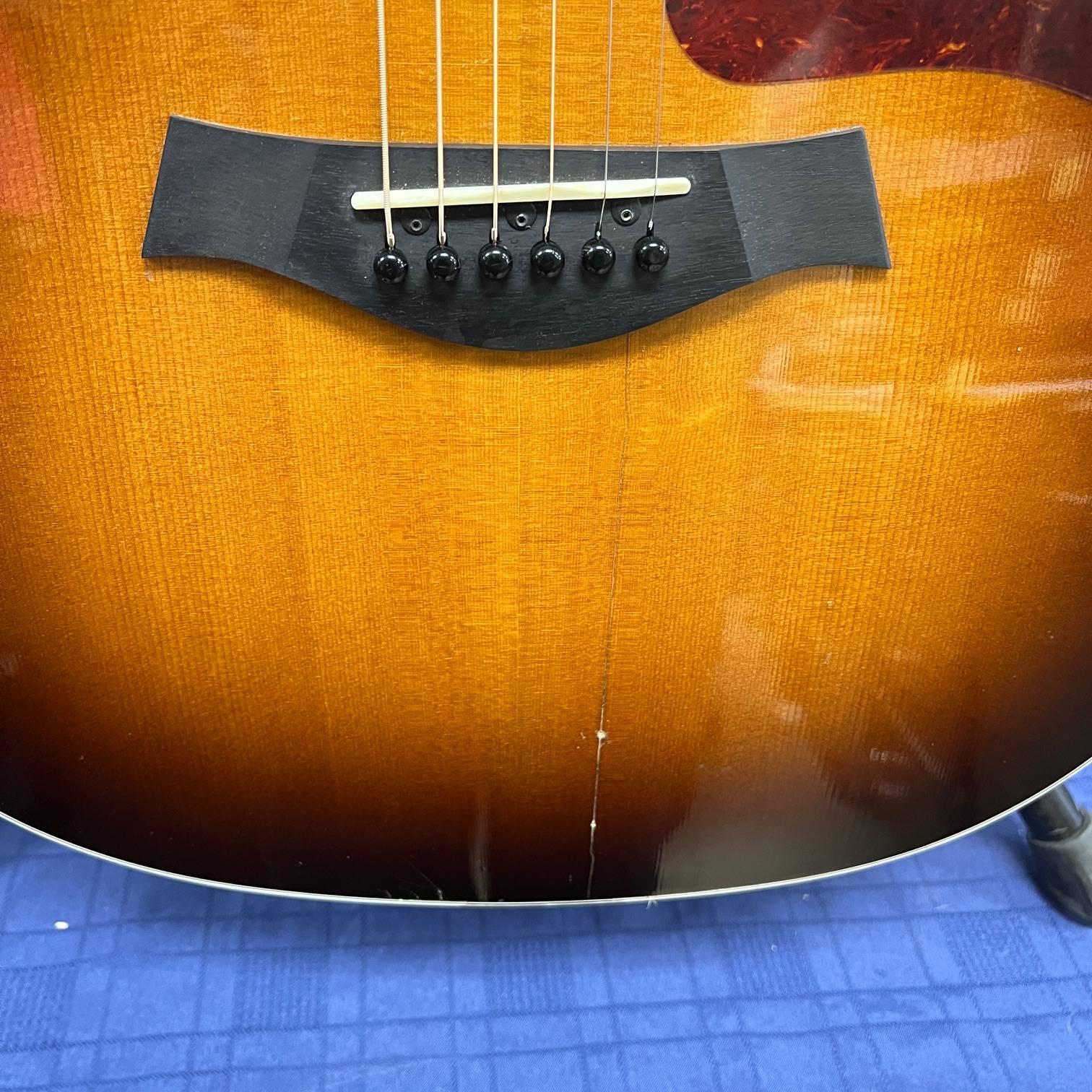 Up for sale is a used Taylor 214e-SB DLX Grand Auditorium acoustic electric guitar. This one was gone over in our repair shop and sounds/plays great. It has a couple small dings in the finish, a crack that runs from the bottom bout to the bottom of the bridge. It looks like it’s been repaired, though we didn’t do the work. The pickguard has a small amount of lift in the upper portion. The electronics all work as they should. It comes with a Taylor case. This one was made in Mexico in 2018, serial number 2107238319. Check out the pictures