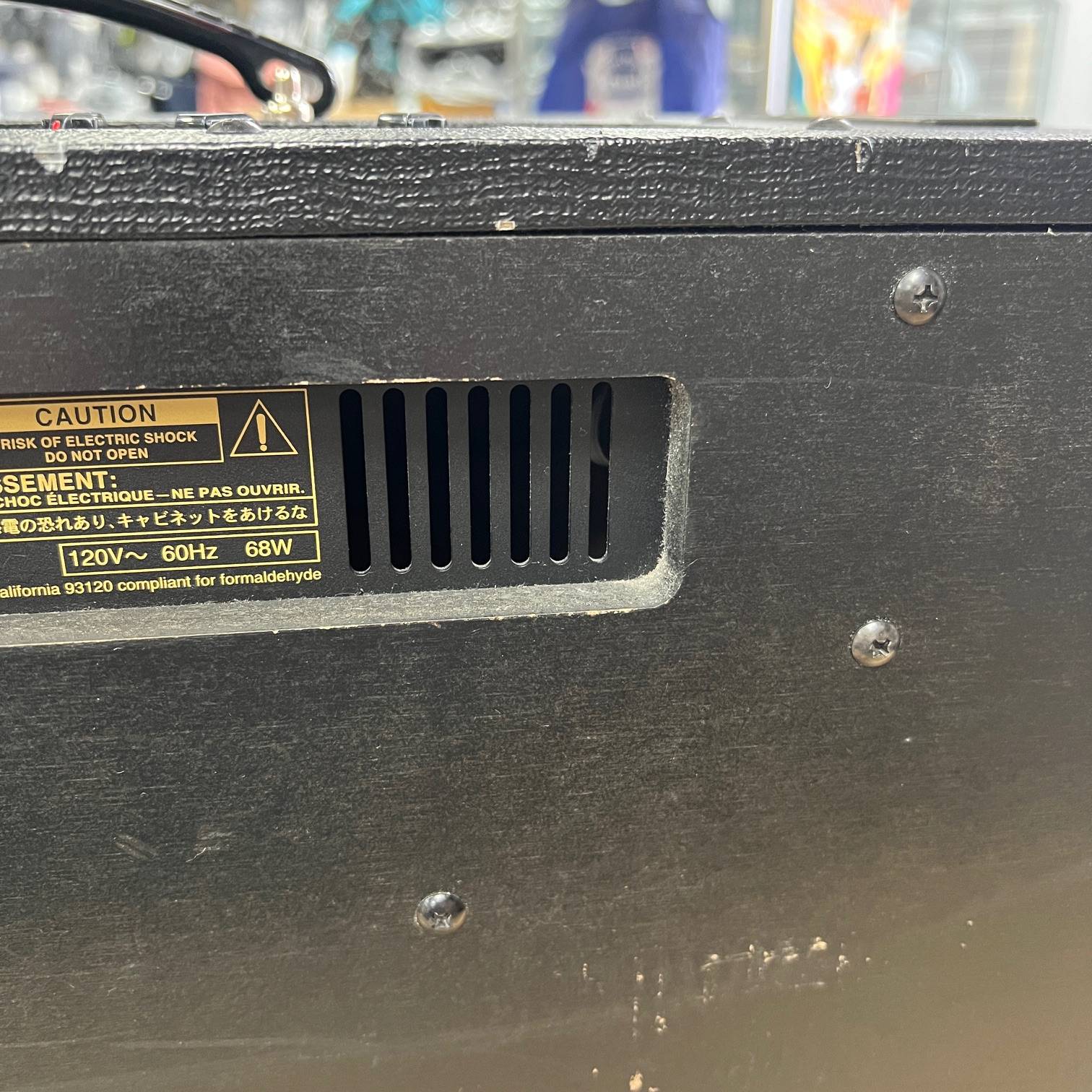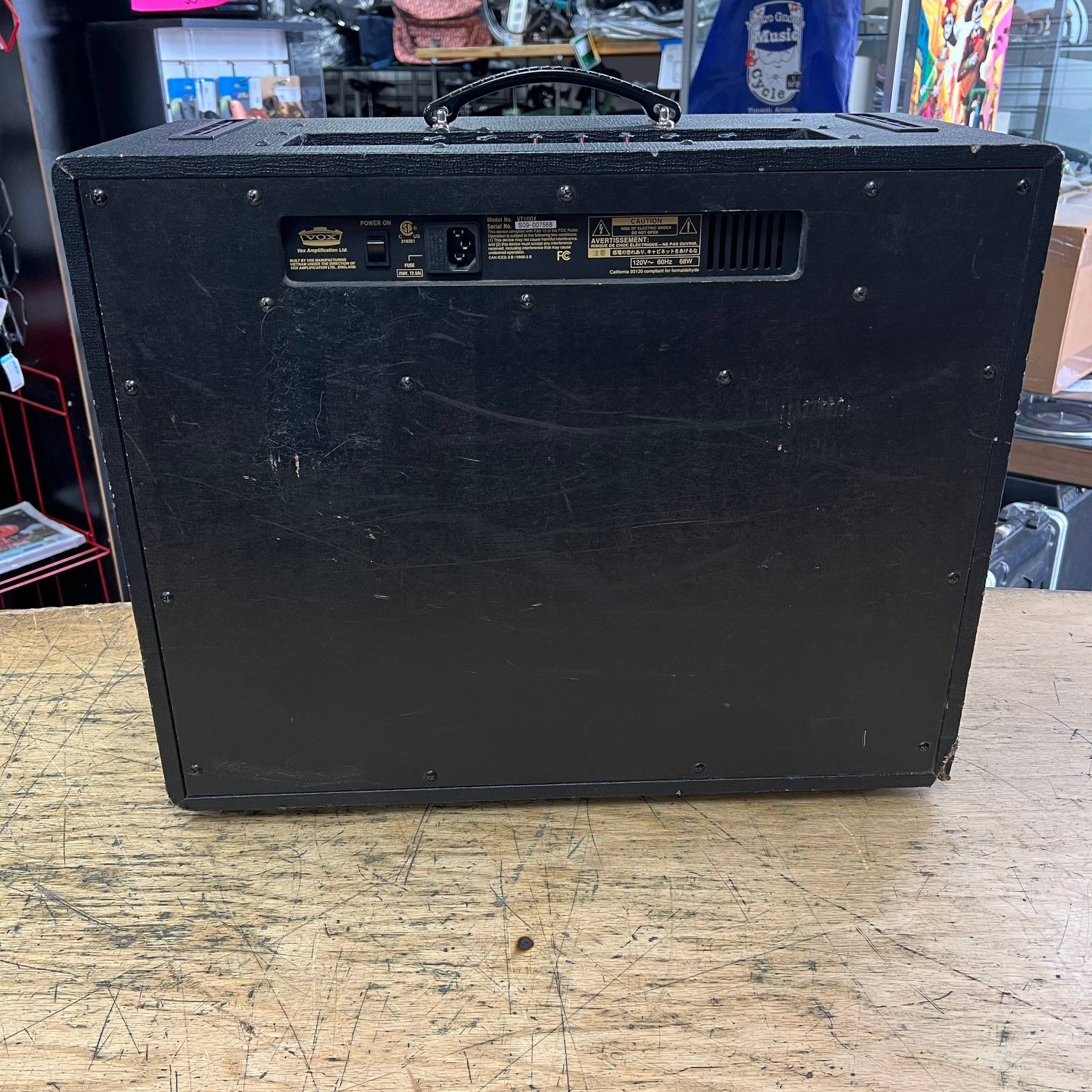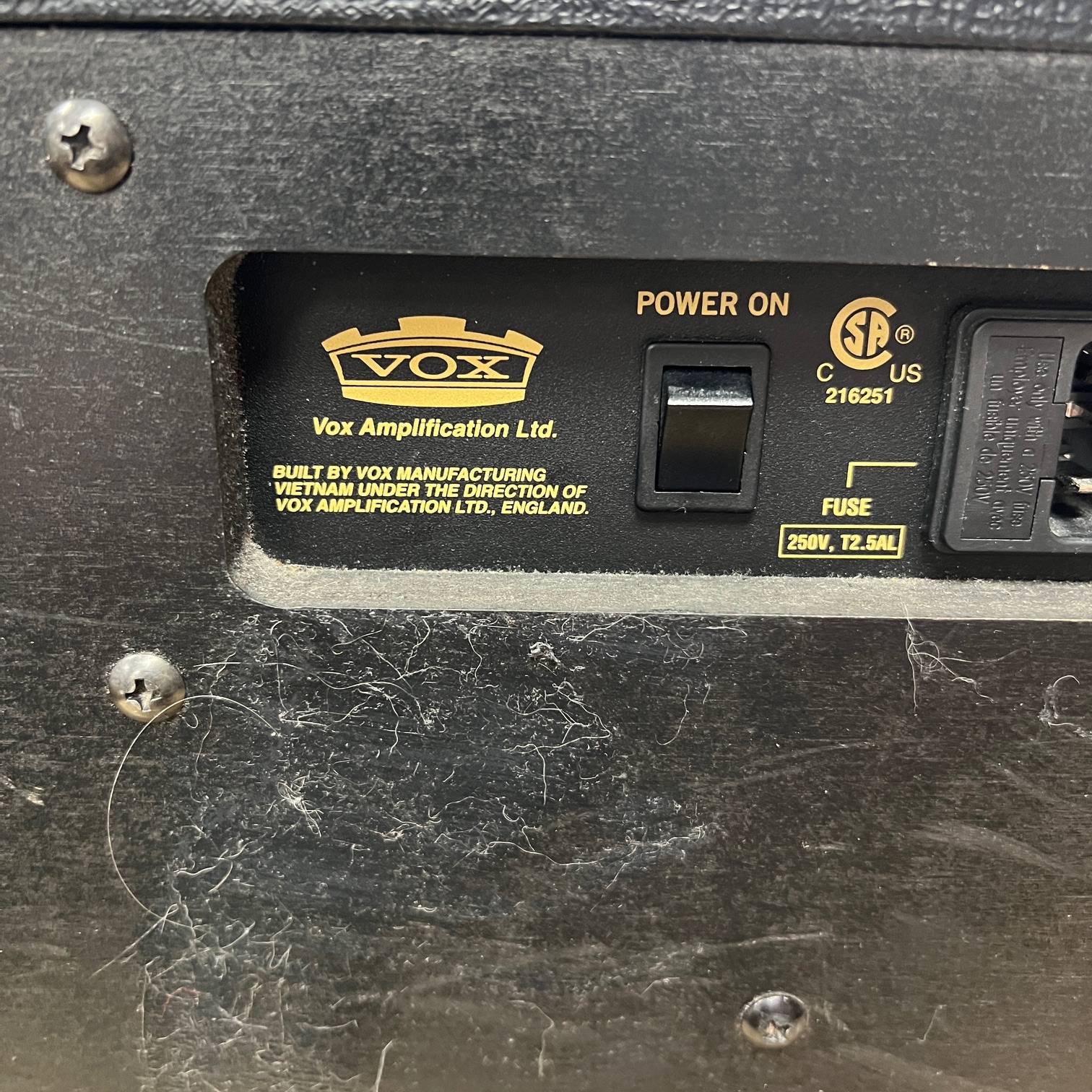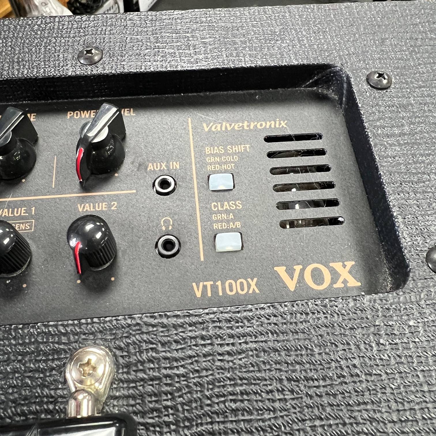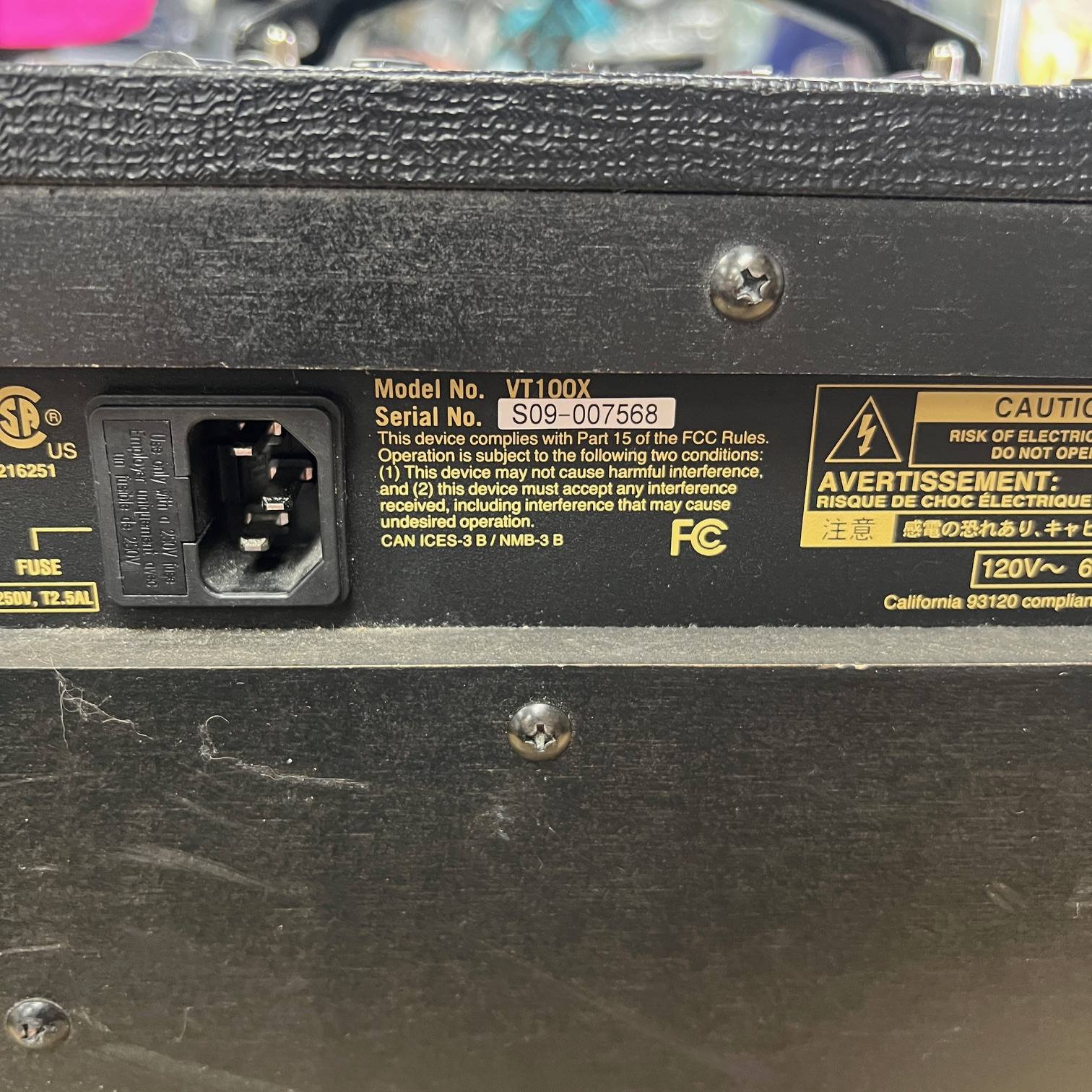 Up for sale is a used Vox VT100X 1×12 combo guitar amp. This one was checked out here in our shop and everything works as it should. It is in good cosmetic condition, but does have some repaired damage to the cabinet at the corner. The amp was made in Vietnam, serial number S09007568. Check out the pictures for the condition, or come see it in person at Metro Gnome Music.
