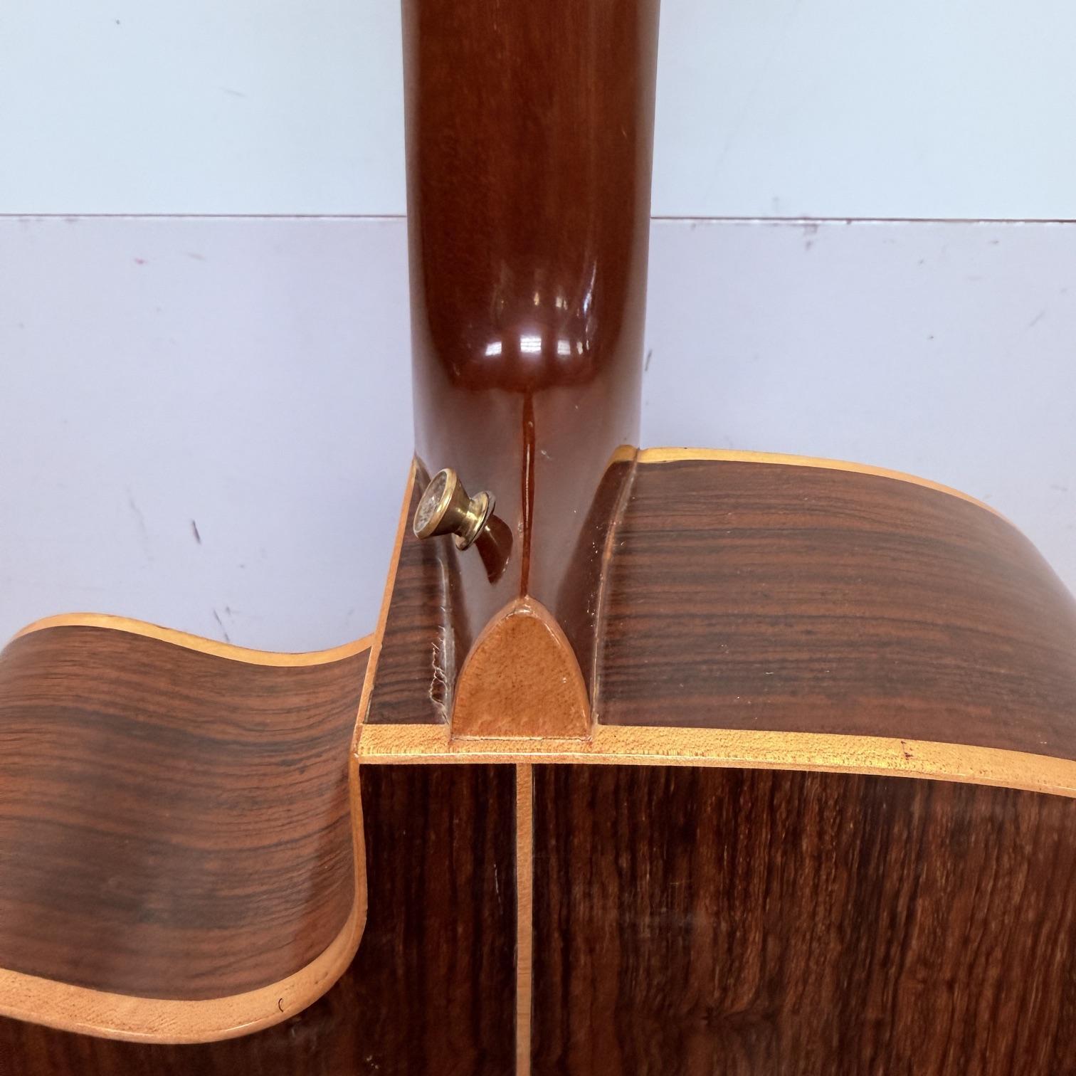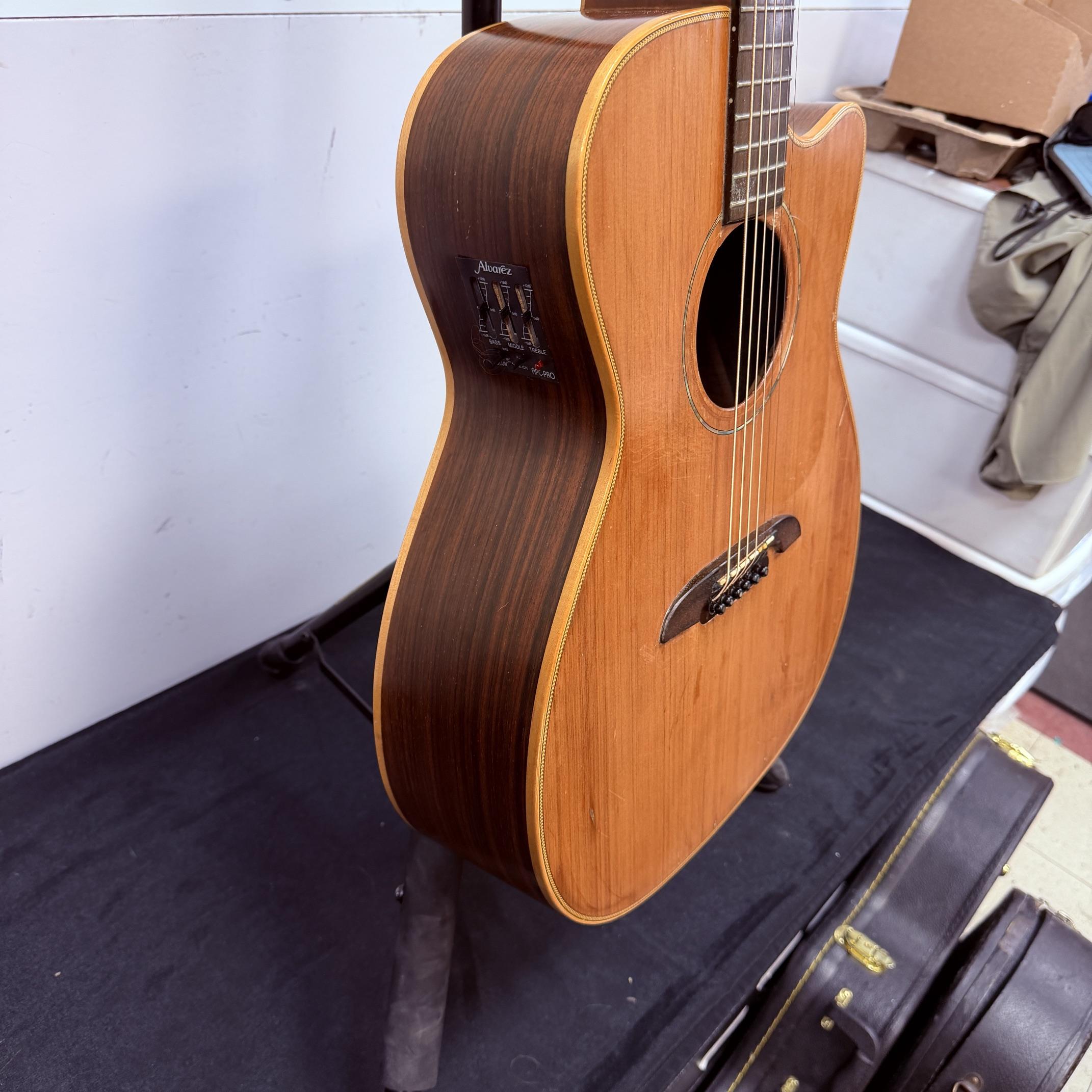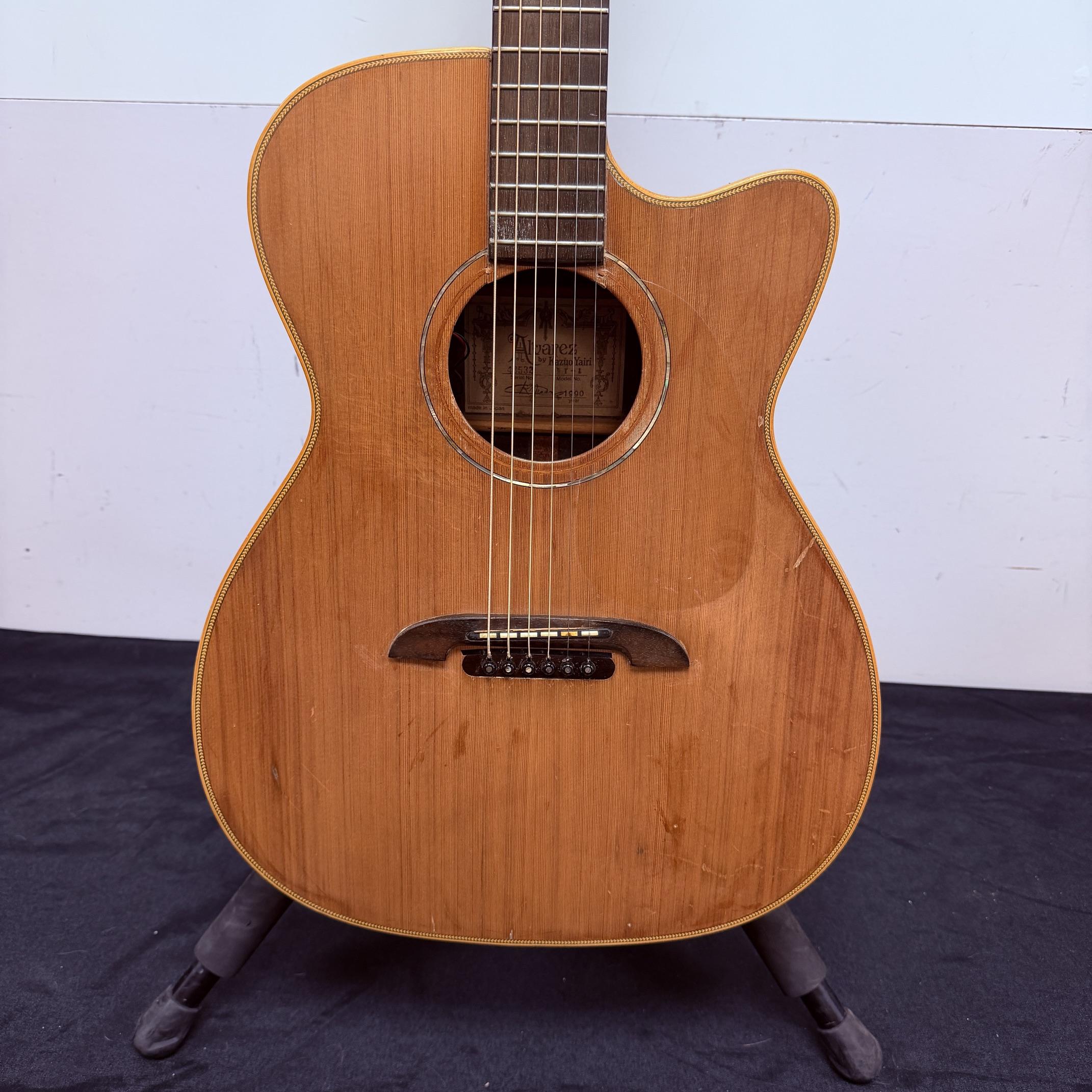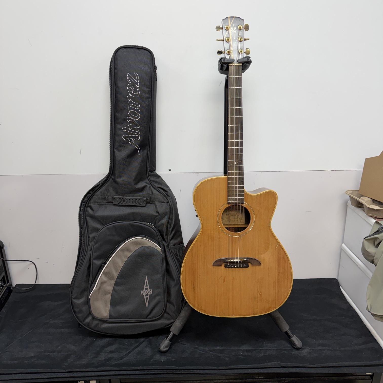 Up for sale is a used Alvarez by Kazuo Yairi DY-1 acoustic electric guitar. This one just had the electronics gone through (Alvarez sent us a new old stock Preamp/EQ that fits very well) and we set it up with new strings. This one definitely has some wear, scratches, dings and some repaired cracks, but it is structurally sound and a player. The original pickguard is no longer on it, but it does have a clear replacement one. It was made in Japan, in 1990, serial number 43532. It comes in a newer Alvarez gig bag. Check out all the pictures for the condition.