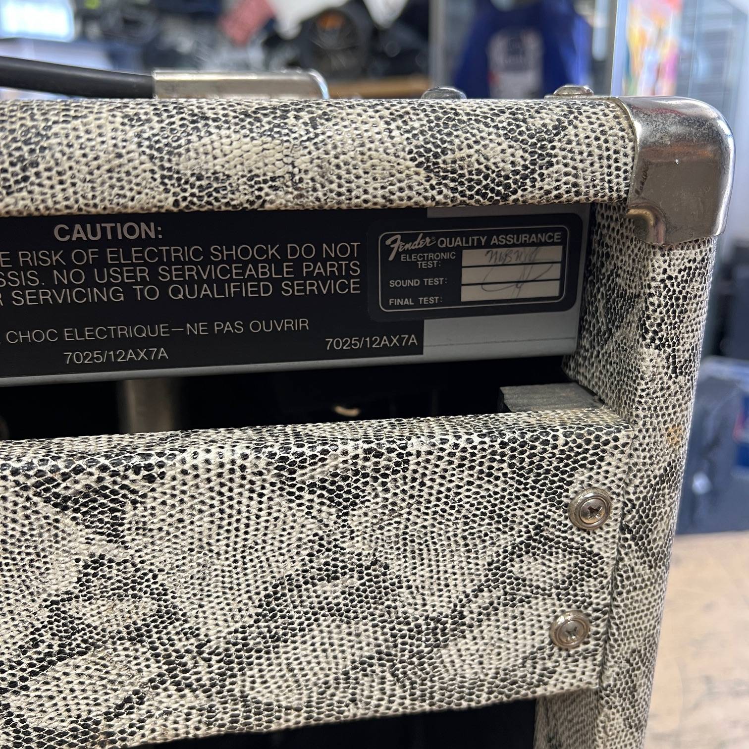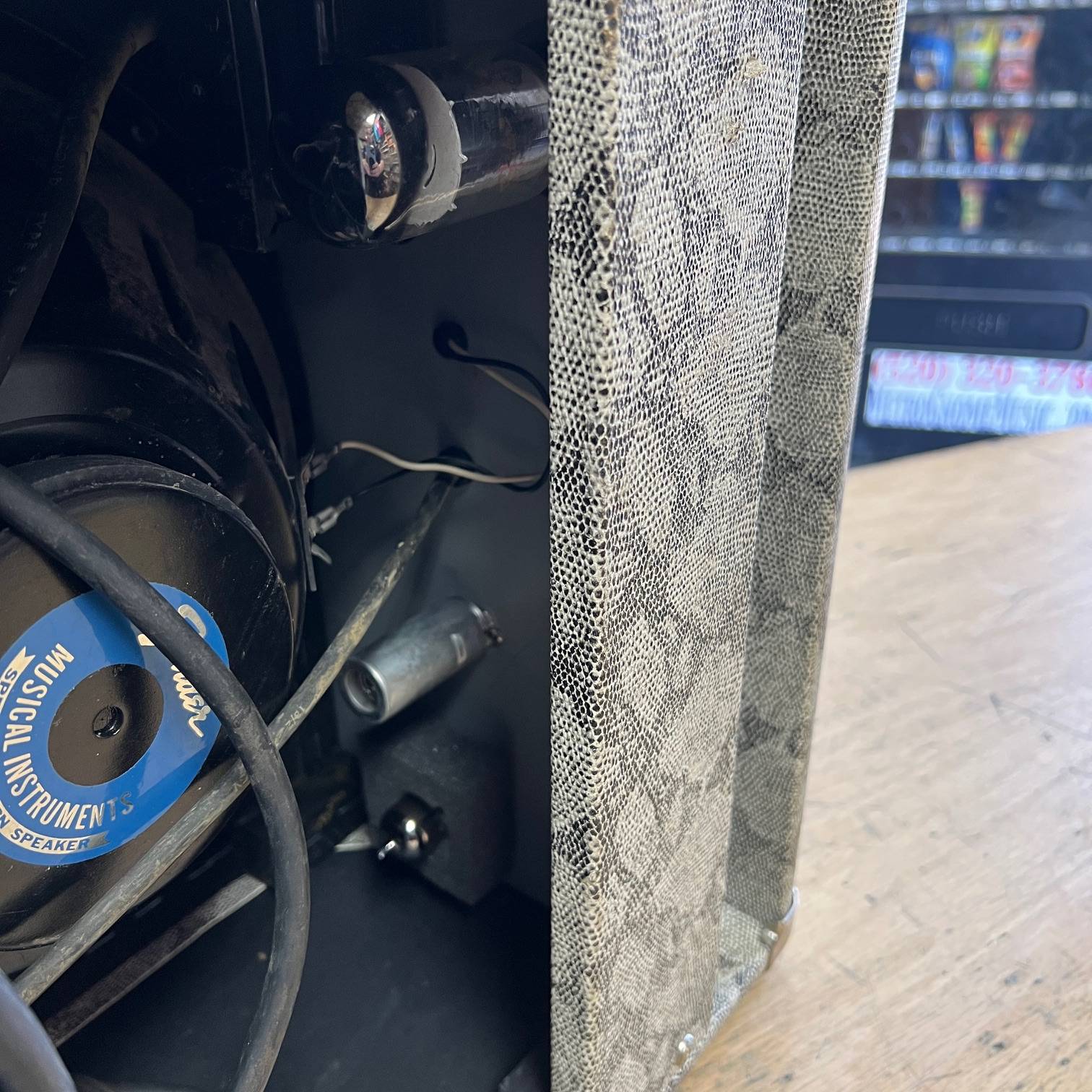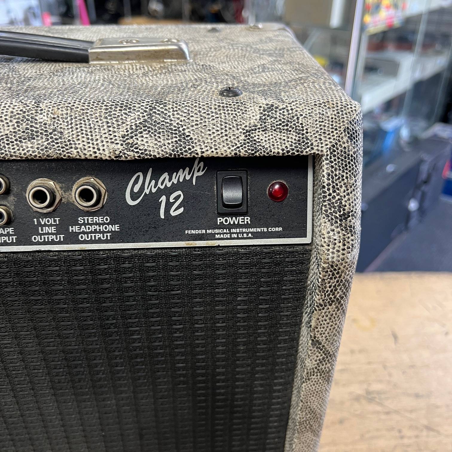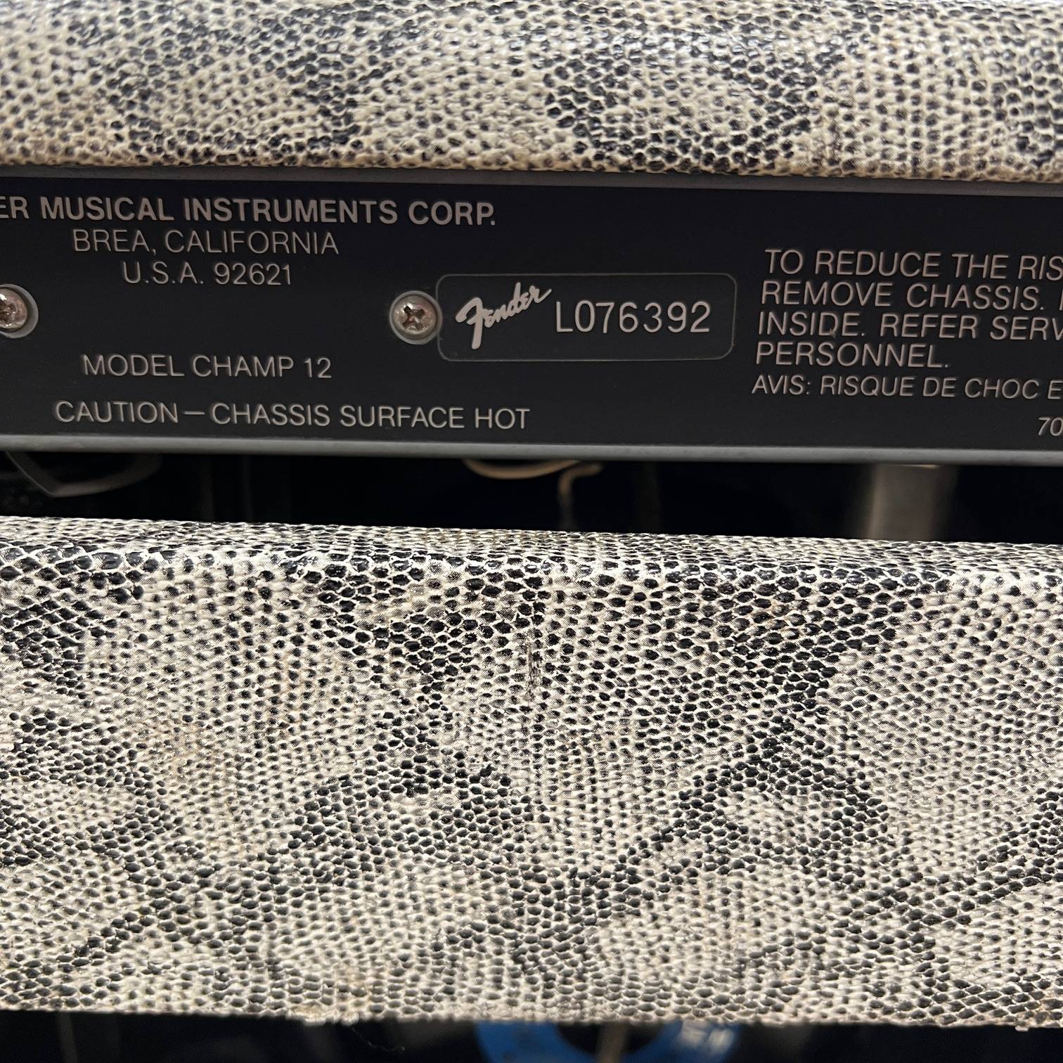 Up for sale is a vintage Fender Champ 12 tube guitar amp. We just had this one serviced by our amp tech and it’s playing great. It shows some wear, but no major rips in the original Snakeskin vinyl tolex. It comes with its original footswitch. The amp was made in the USA, serial number L076392. Check out the pictures for the cosmetic condition, or come see it at Metro Gnome Music