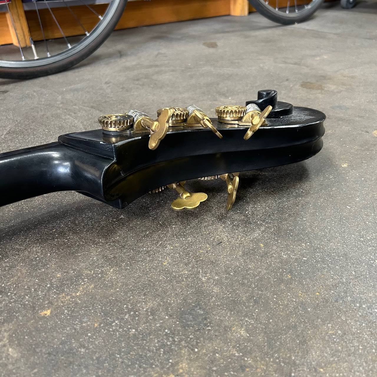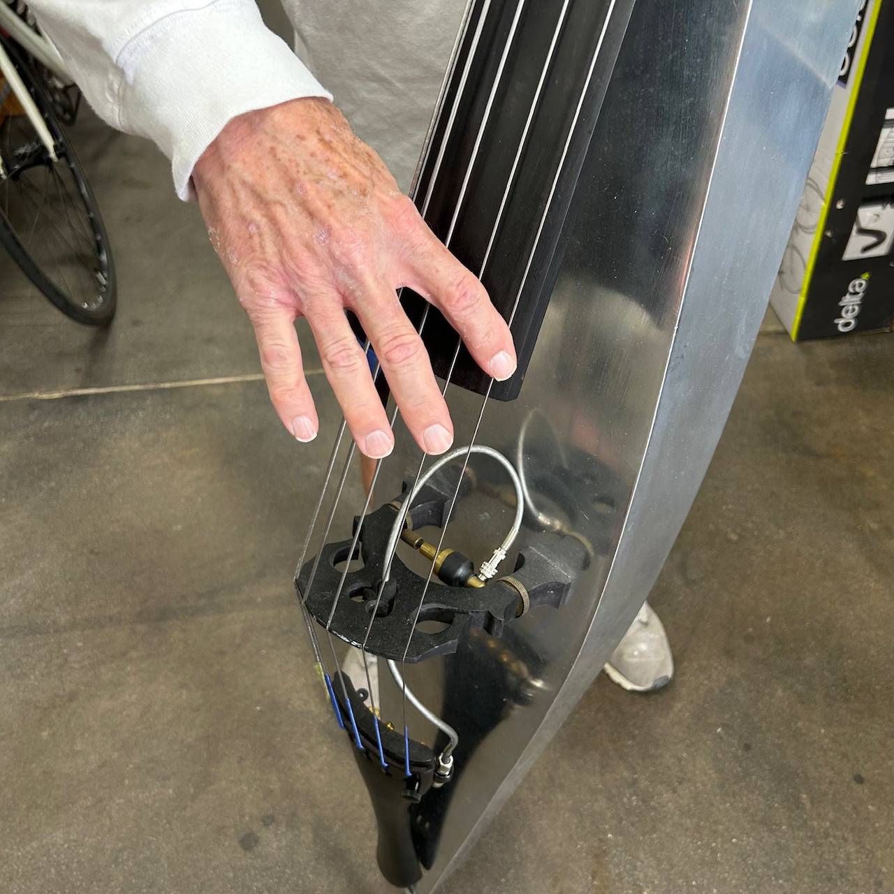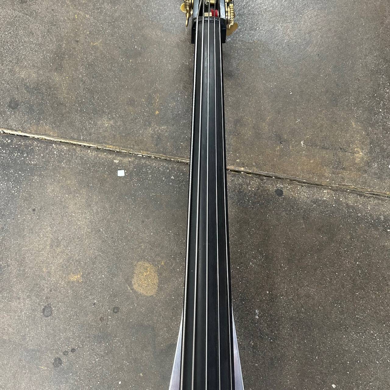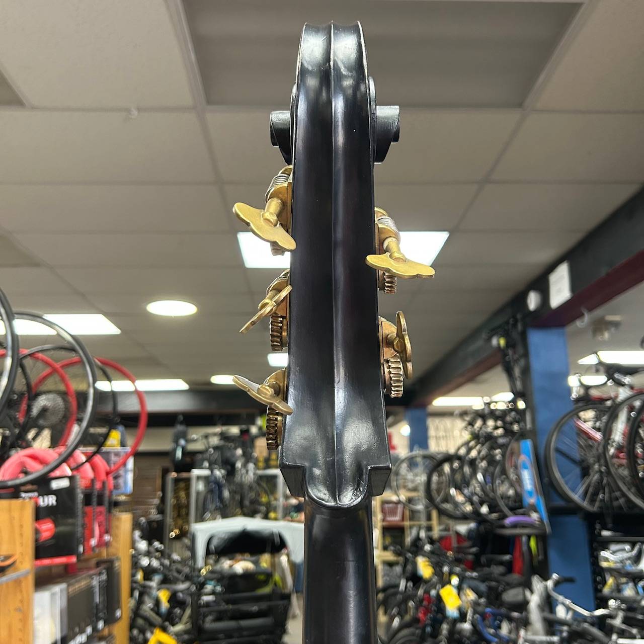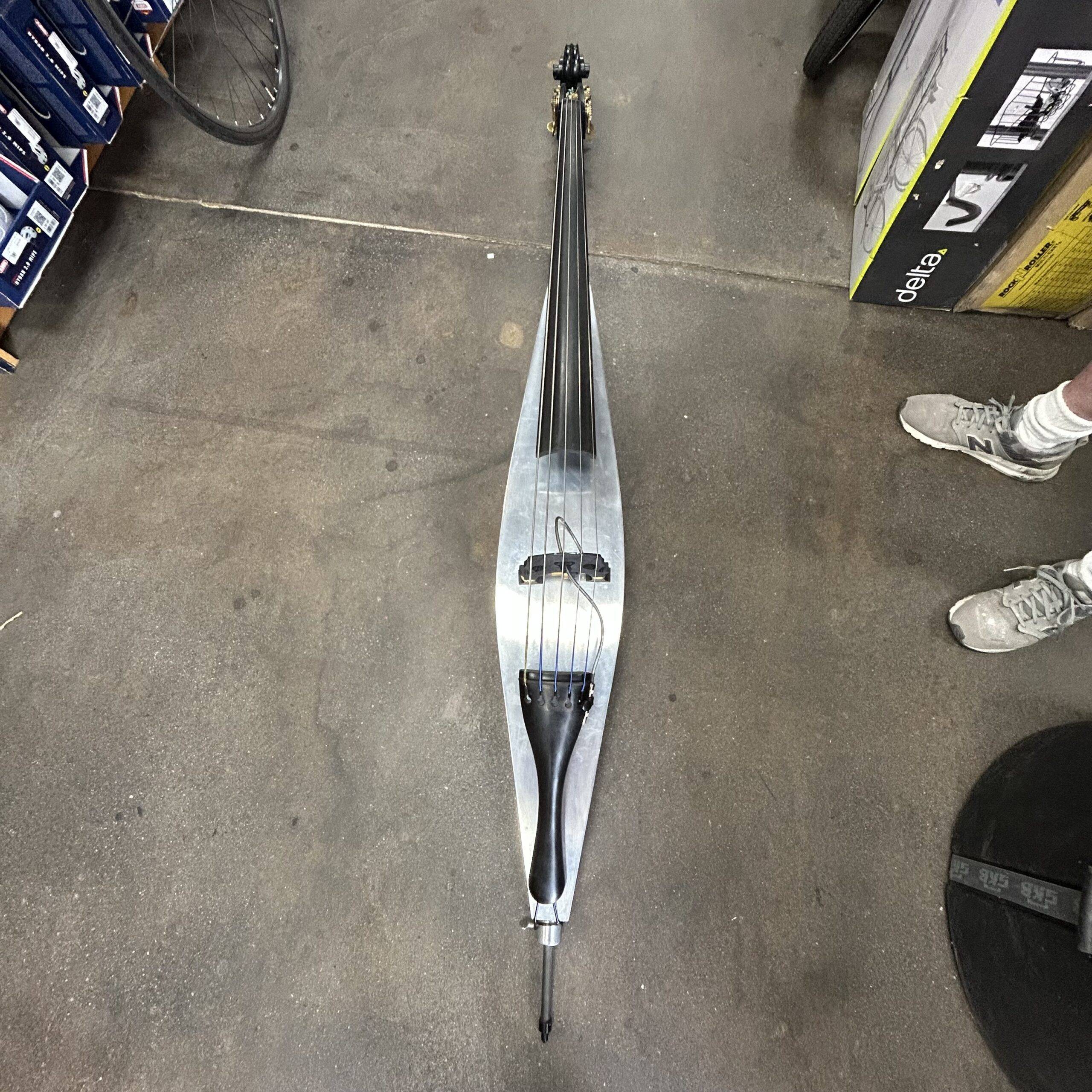 Here we have a very unusual electric 5-string upright bass. This was made by a Dutch luthier named Henk Van Zalinge in the late 1970’s. It features an aluminum body with a wood neck and and a very thick ebony fretboard. This one has a vintage Polytone pickup in it. This is a very early 5-string upright, (maybe a prototype?) The neck is very straight and the action is set very low for an upright. It plays great. These were popular back in the day. I believe Sting owns a couple and used one on Synchronicity.