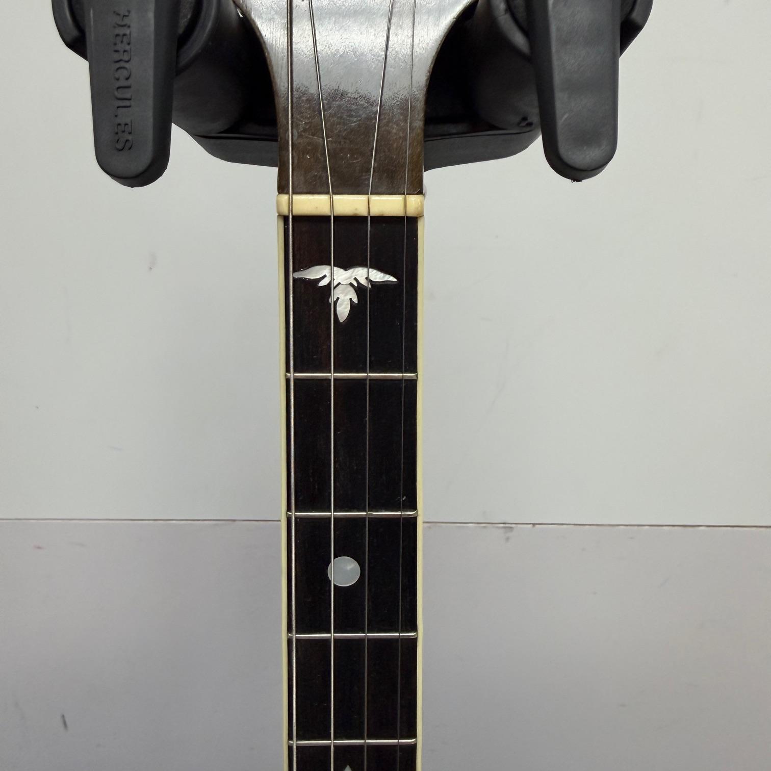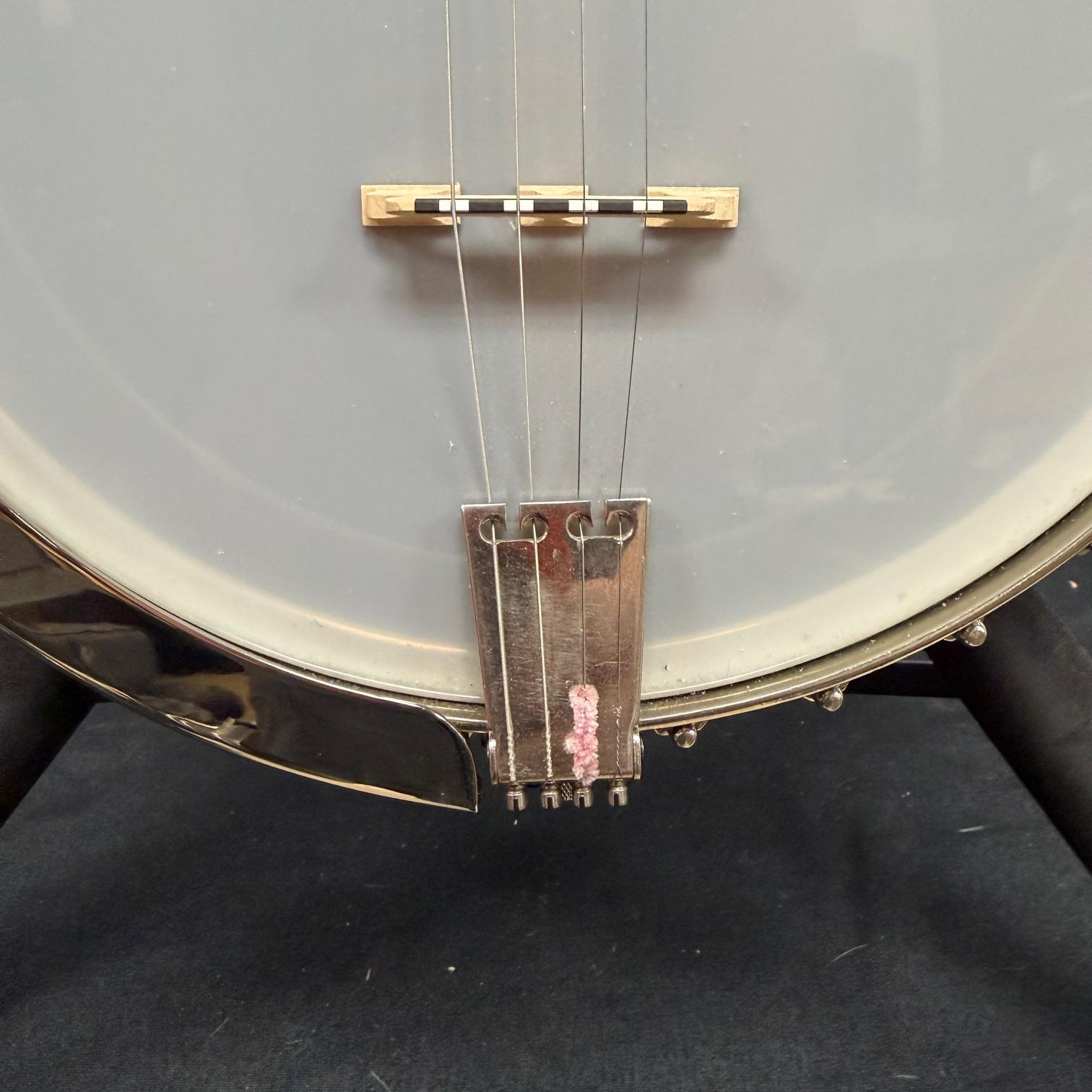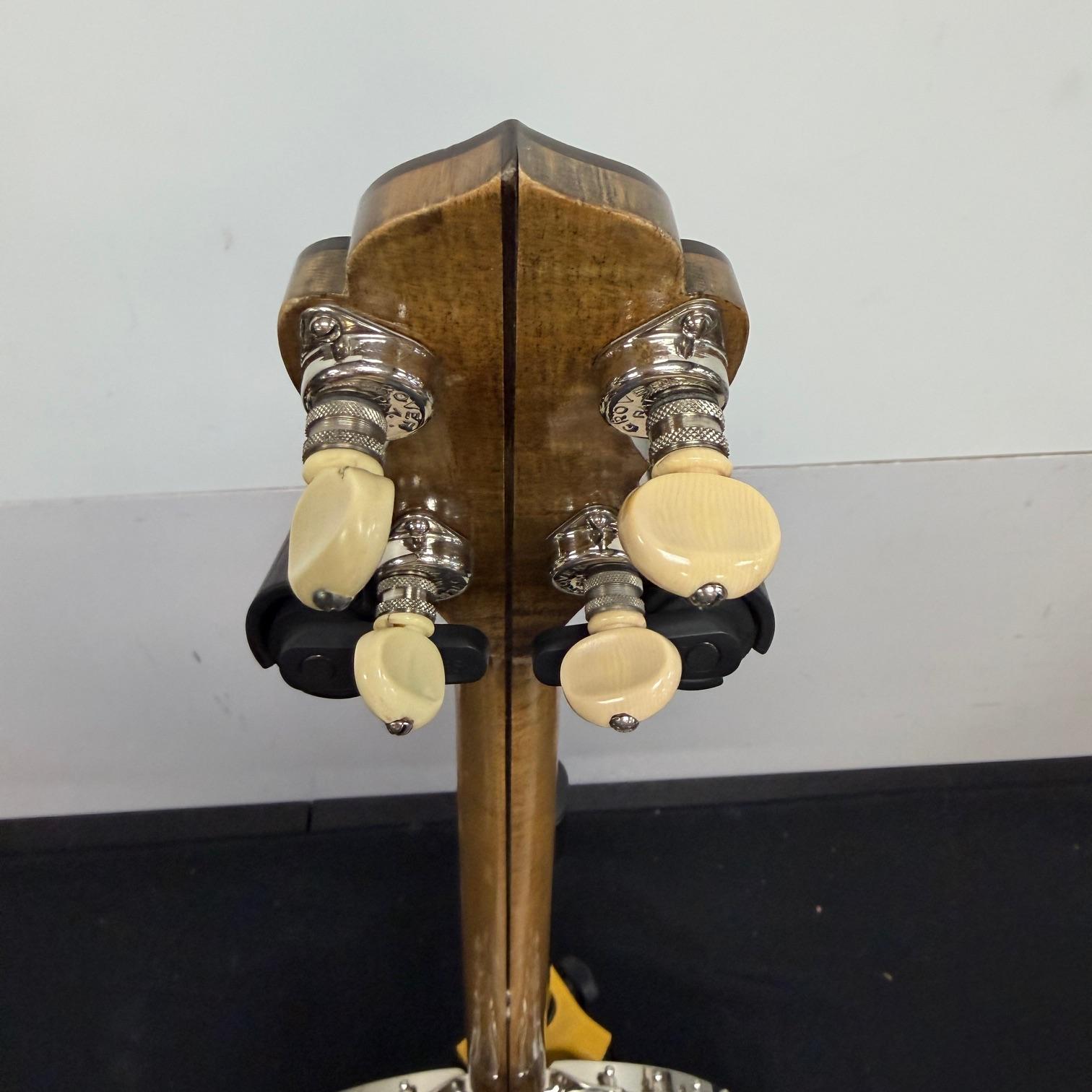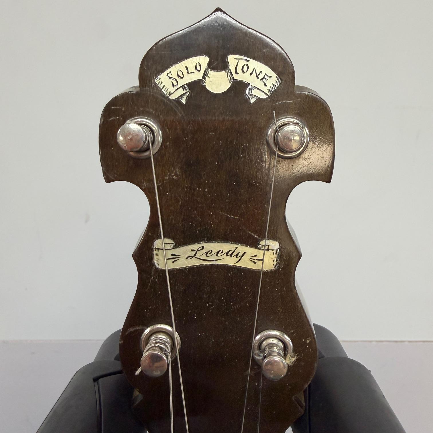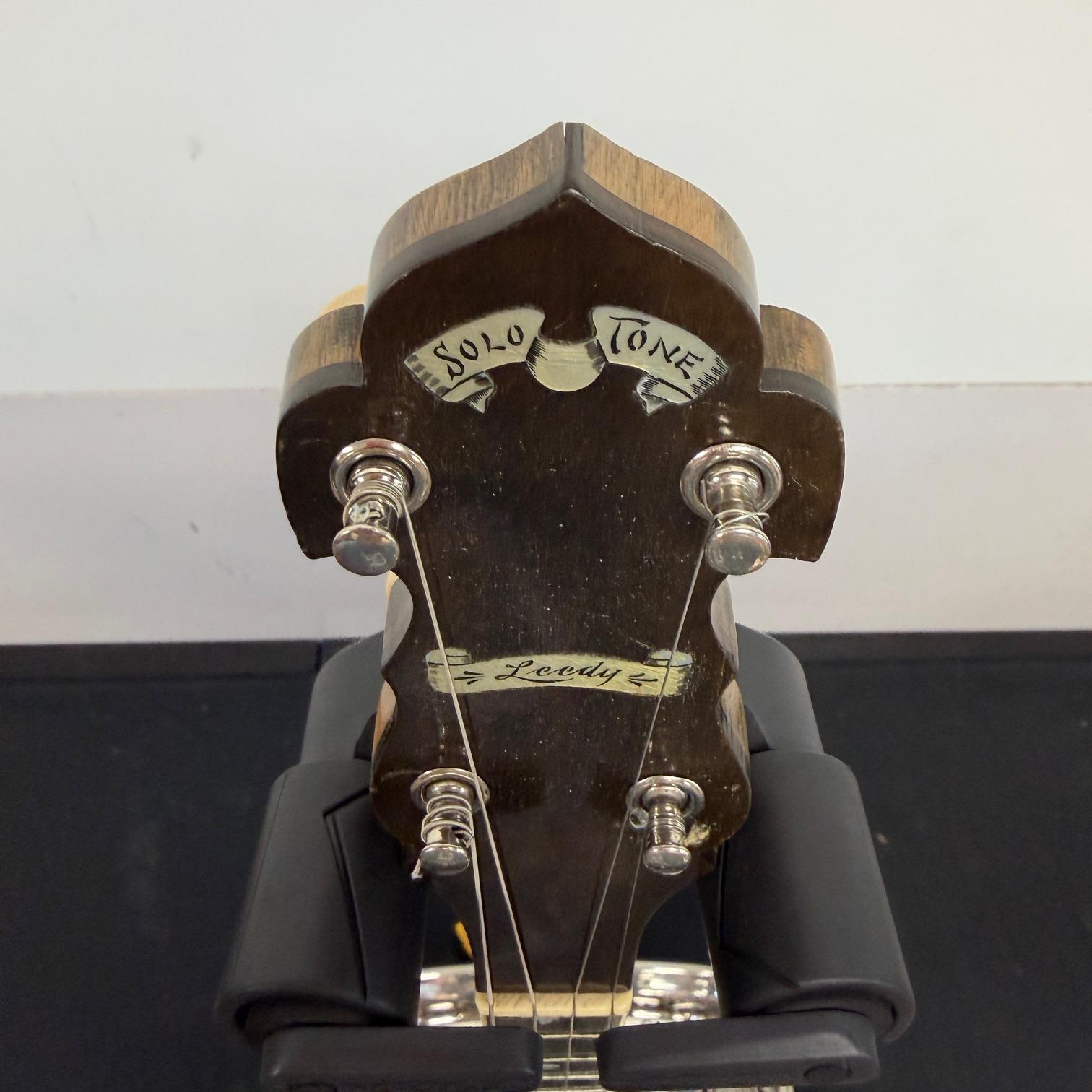 Up for sale is a vintage Leedy Solo Tone 4-string tenor banjo with resonator. We checked it out in our shop and it’s ready to play. It shows some wear, but no major dings or scratches, and is structurally sound. The resonator on this one is a beast and has a beautiful wood back. This one was made in the USA, serial number 356. It comes in a nice SKB wood case. Check out the pictures!