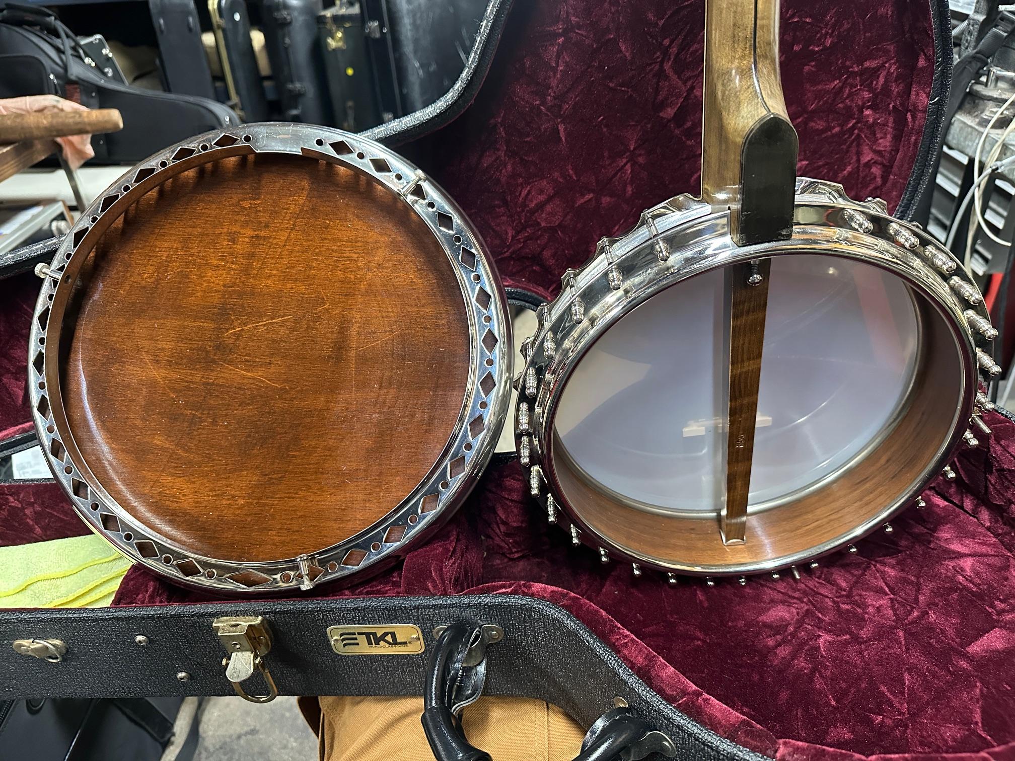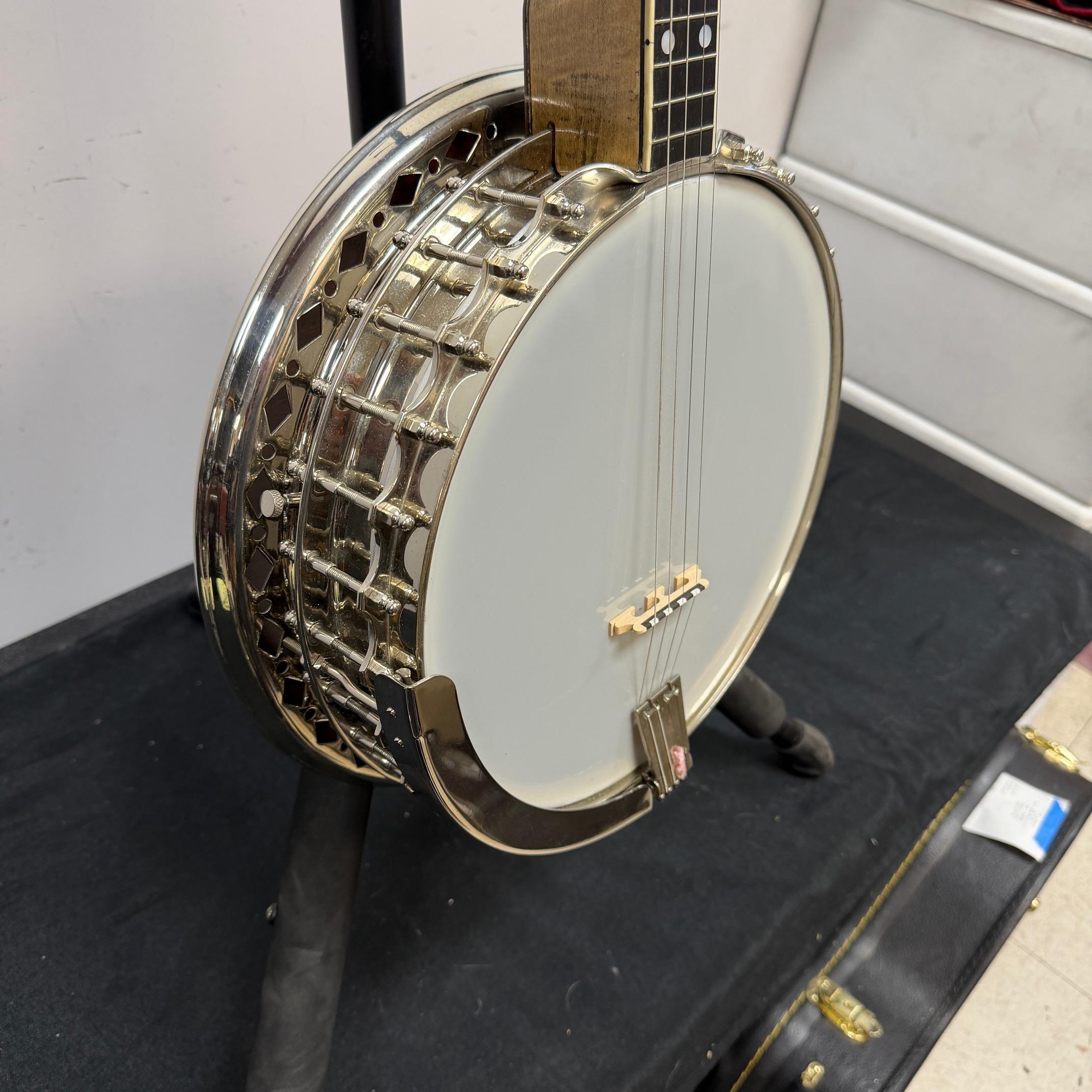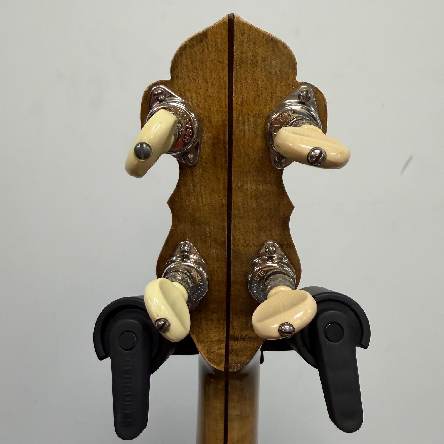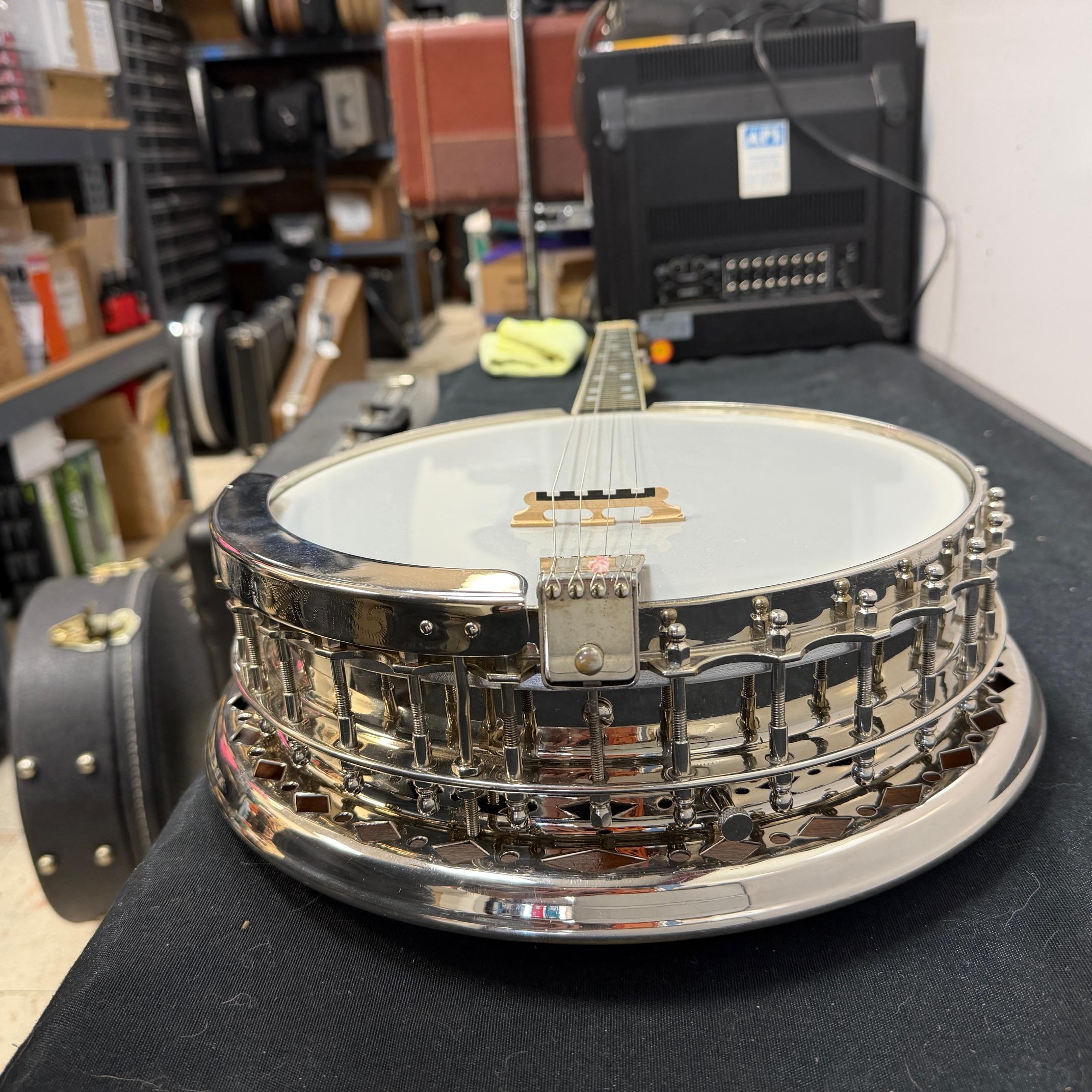 Up for sale is a vintage Leedy Solo Tone 4-string tenor banjo with resonator. We checked it out in our shop and it’s ready to play. It shows some wear, but no major dings or scratches, and is structurally sound. The resonator on this one is a beast and has a beautiful wood back. This one was made in the USA, serial number 356. It comes in a nice SKB wood case. Check out the pictures!